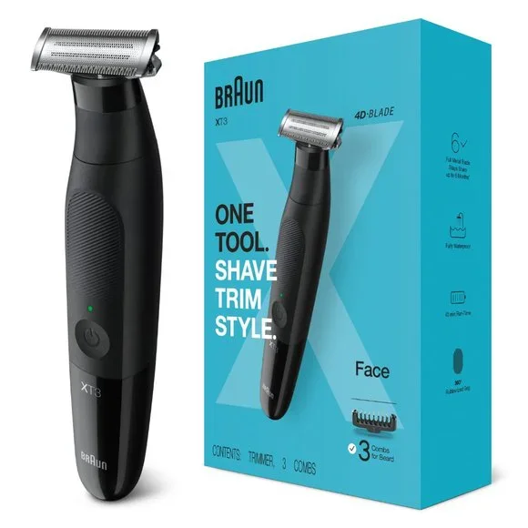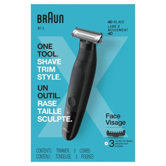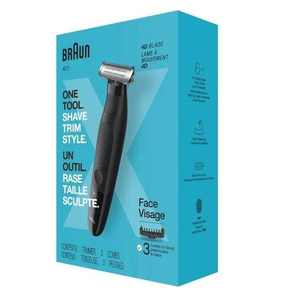 Series XT3 is a trimmer, body groomer and electric razor for men, all in one tool. Its 4D-Blade delivers an easy and comfortable shave that is gentle on the skin. This trimmer and shaver can be used wet or dry and its metal blade is built to last up to 6 months. The slim design and anti-slip grip make it surprisingly easy to handle. Based on 2x full shaves per week, actual results may vary. Box includes: 1 X Electric shaver, 3 X Beard combs, 1 X Smart plug.Shave, trim and edge with one tool