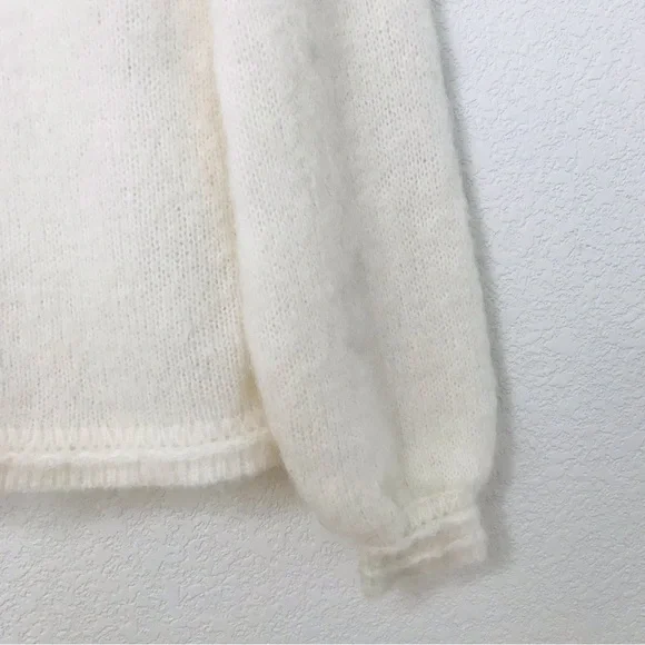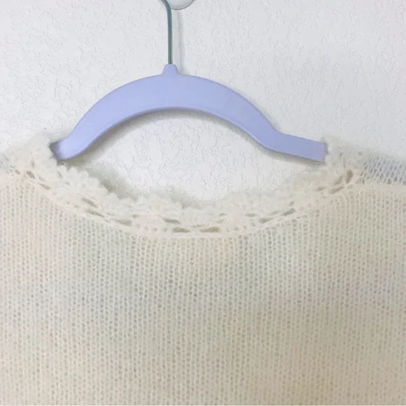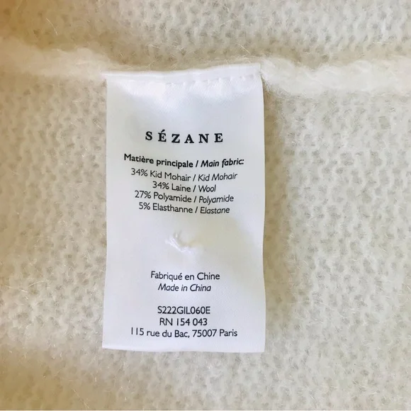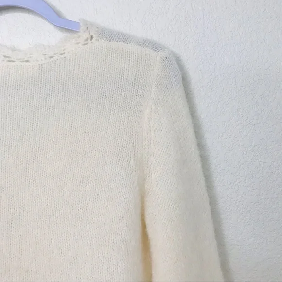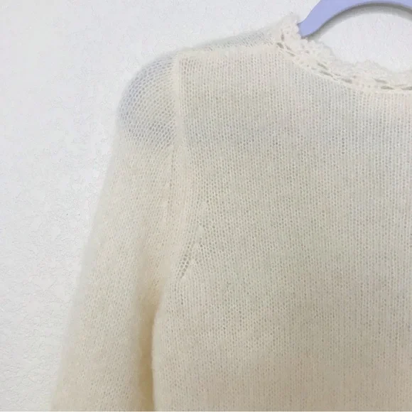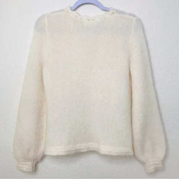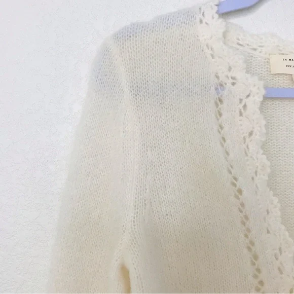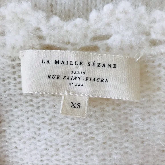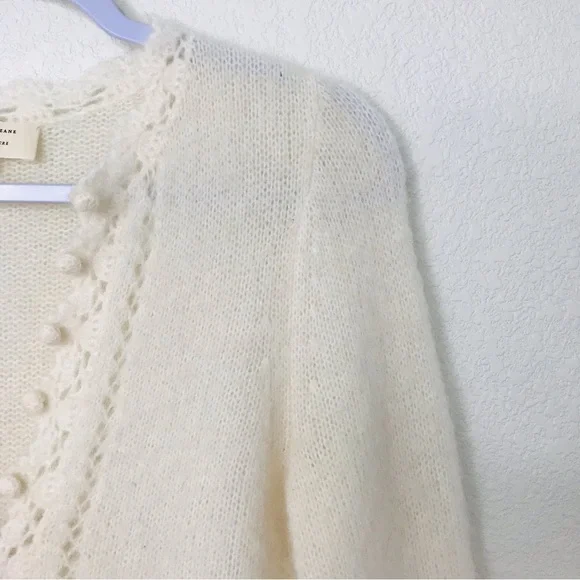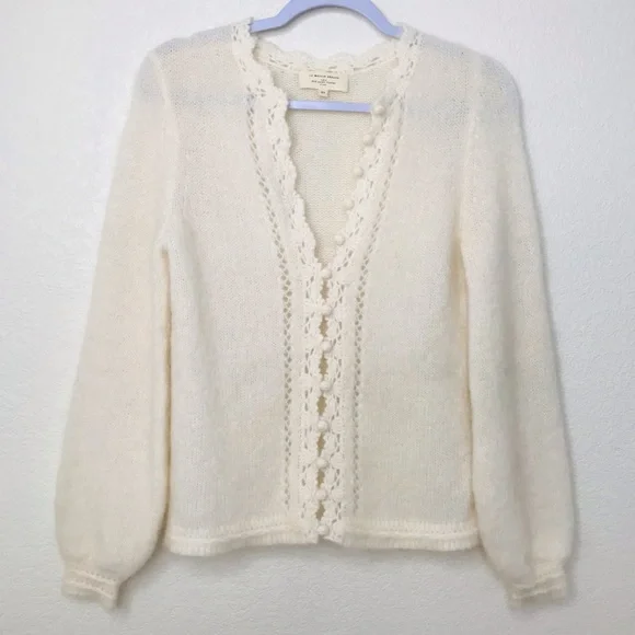 Super soft and elegant cardigan from La Maille Sezane. Full button front. Long sleeves in a slight balloon style. Open work knit detail on front. Crochet edge along placket and neckline. Round neckline. Comes with extra button at garment tag. Kid Mohair/Wool/Polyamide/Elastane. Underarm to Underarm - 17”; Length - 22 1/2”. All measurements approximate. Excellent pre-owned condition. (Note- Stock photo shows very similar design - see photos.)Quiet Luxury, Mohair, Designer, Luxury, Cottagecore, Prairiecore, Feminine, Cozy, Comfy, Date Night, European, French Chic, Sophisticated Urban