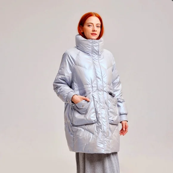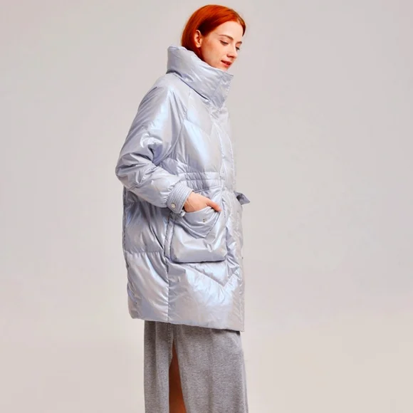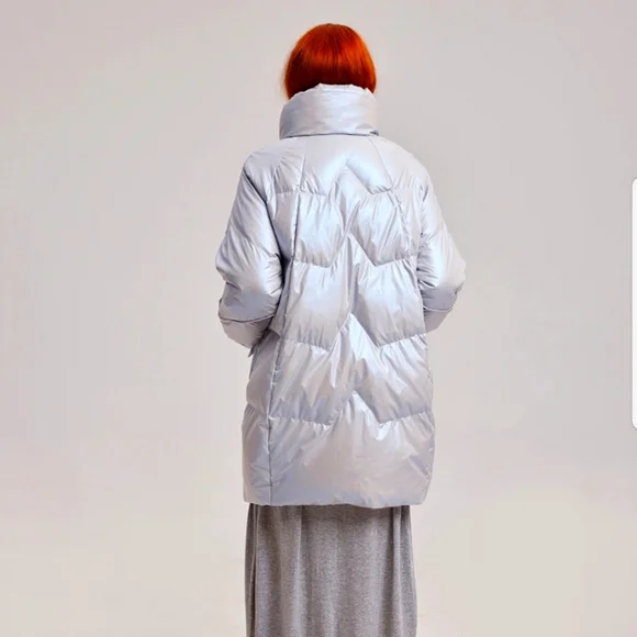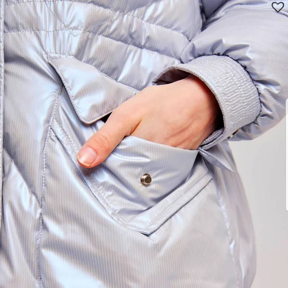 Shiny Boxy Midi Puffer Jacket in a beautiful unique Silver/Iridescent Blue color with quilted pattern, by NAP Loungewear.Features high collat, oversized silhouette, front flap pockets, zipper and button front closure, and snug fit cuffs to keep the cold air out.Size MediumNew with TagsFill: 90% white duck down 10% featherShell: 100% Polyester See pics for additional detail. This coat is even more stunning in person!Please see photos for actual product color, which may differ slightly from stock photos. Also see posted size chart pic for measurement information. All sales are final per Posh guidelines. Thank you!