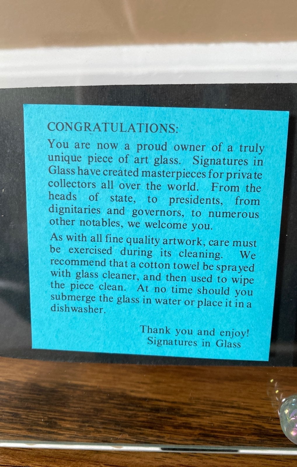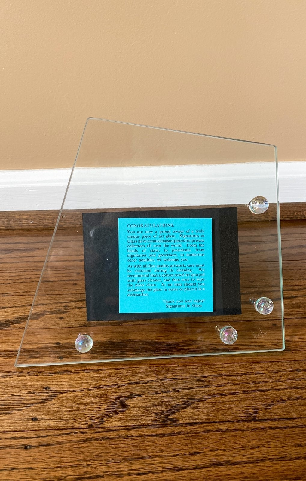 Glass picture frame with four iridescent glass jewels as detail and has a small signature in the corner. Frame works with both horizontal or vertical pictures. Glass piece to protect the picture. Fits a 5X7 picture. Small fingerprints on glass frame and some dust that can easily come off/be cleaned. Never used