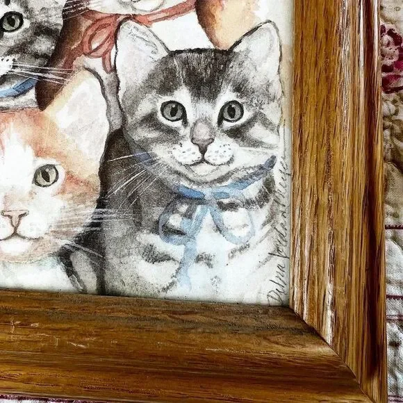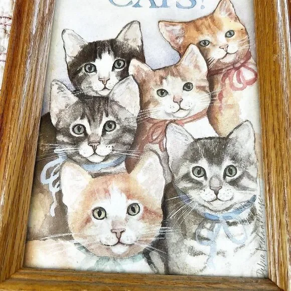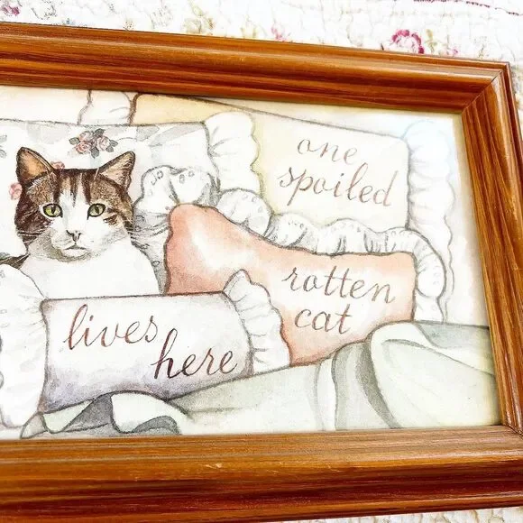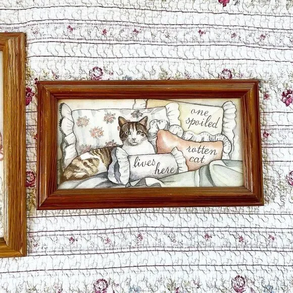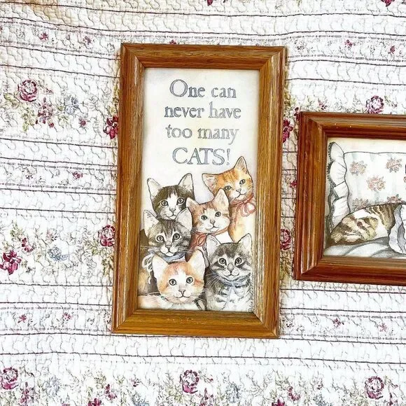🐈 1980’s SIGNED VINTAGE Pair Of Wood Framed Darling Cat Prints 🐈Ok, calling all CAT LADIES & CAT FELLAS! This super cute pair of 1980’s, wooden framed pictures, are PERFECT for a bedroom, bathroom, office or living room. Each kitty has a pink or blue ribbon tied at their necks and the other photo shows a kitty lounging on a bed with pillows! “One can never have too many cats” and “One spoiled rotten cat lives here” will be what you’re receiving. Both are professionally backed and framed by FIJI GRAPHICS.They each measure 12x6. Soft watercolor looks to them. Can’t make out the signature, but I believe it reads “Delna Jordan Meyer”.EXCELLENT CONDITION!!!*ALL SALES FINAL. We take pride and providing you with excellent photos, accurate measurements in a thorough description and are happy to send additional photos or information prior to purchase. Please take our measurements and compare them to something that you have that you love. Thanks in advance.SIGNED KITTY CAT 1980’s 80s Vintage Pair Set Kitties Cats Framed Wall Art Print.