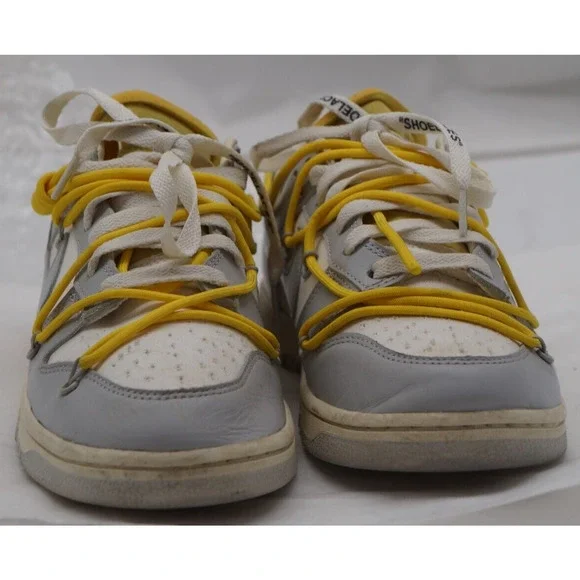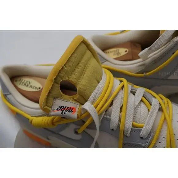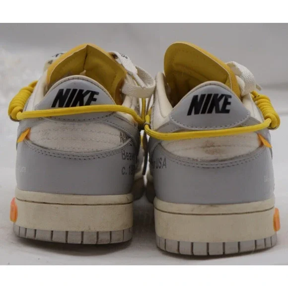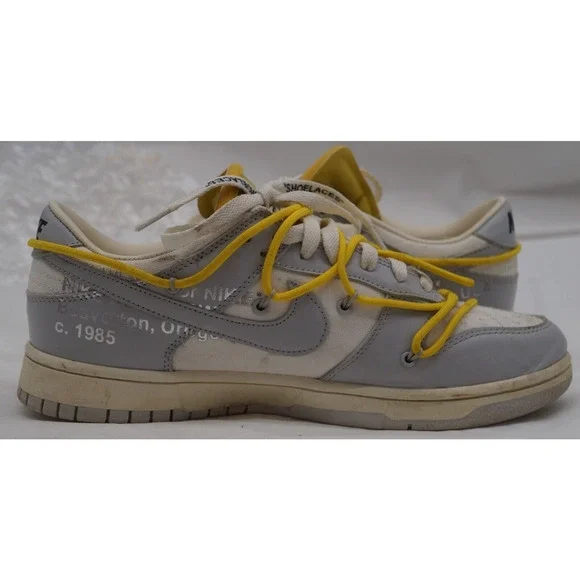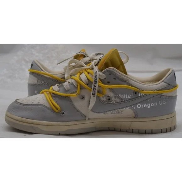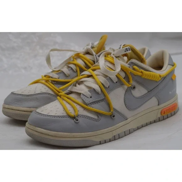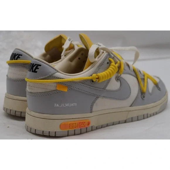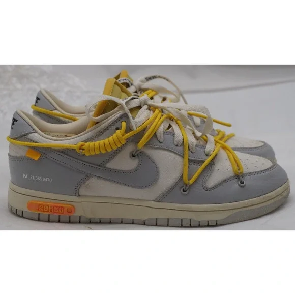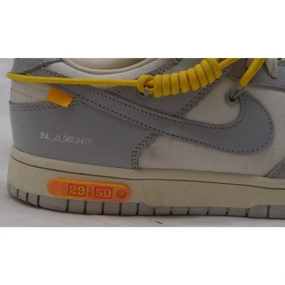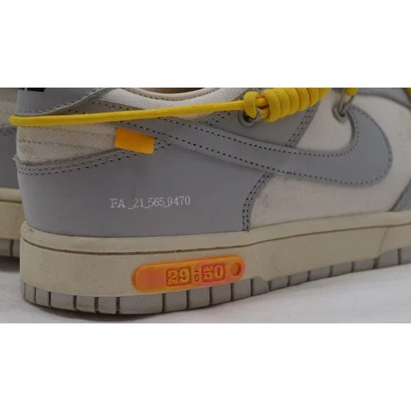 Elevate your sneaker game with the Nike Dunk Low x Off-White 'Lot 29 of 50' in a sleek Sail and Neutral Gray colorway. The iconic collaboration delivers a unique twist on the classic silhouette, featuring a low top design that's perfect for everyday wear or casual outings. Crafted with a premium leather upper, these kicks offer both durability and comfort. The Size 10 athletic sneaker is part of the esteemed Nike Dunk product line and boasts the Style Code DM1602-103. Released in 2021, the sneaker merges the renowned quality of Nike with the trendsetting vibes of Off-White, making it a must-have addition to any sneaker enthusiast's collection.