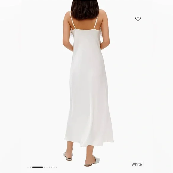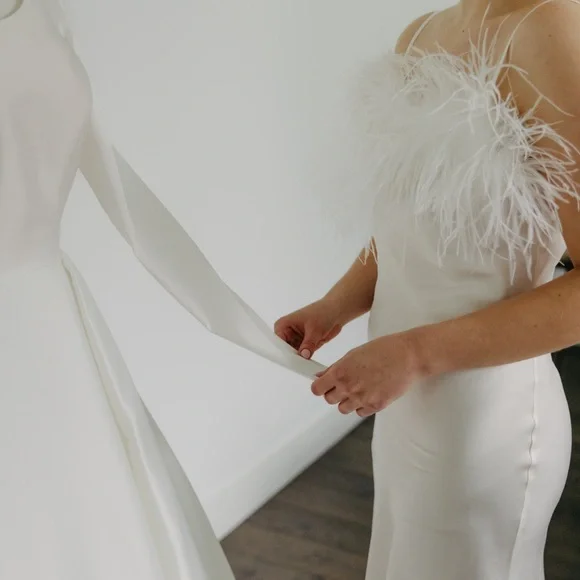 Midi slip dress with white feathers and adjustable spaghetti straps. Cut from EcoVero rayon known for its sustainable properties, this dress offers a soft feel and a lavish appearance.100% ecovero rayon STANDARD 100 by OEKO-TEX®100% feathersDry clean onlyCool ironIron on reverse sideDo not bleachFeathers care:Do not washFits true to size.Wore it once just for a few hours my wedding morning of, perfect condition!!