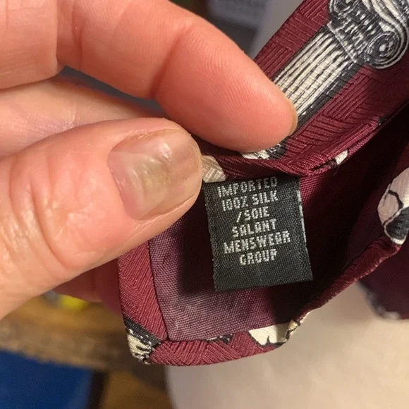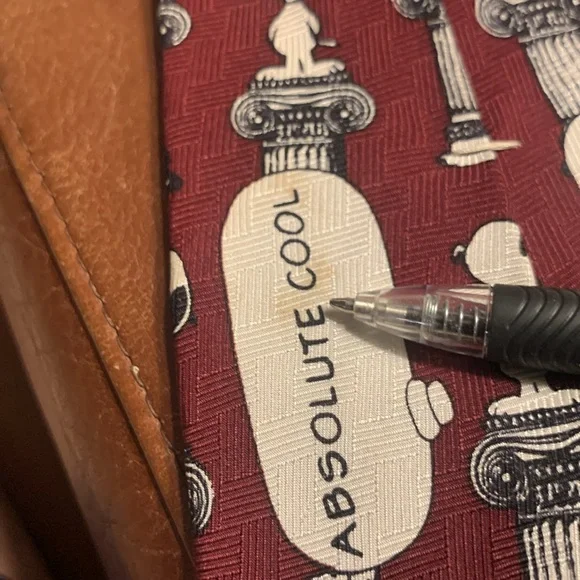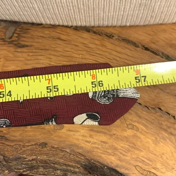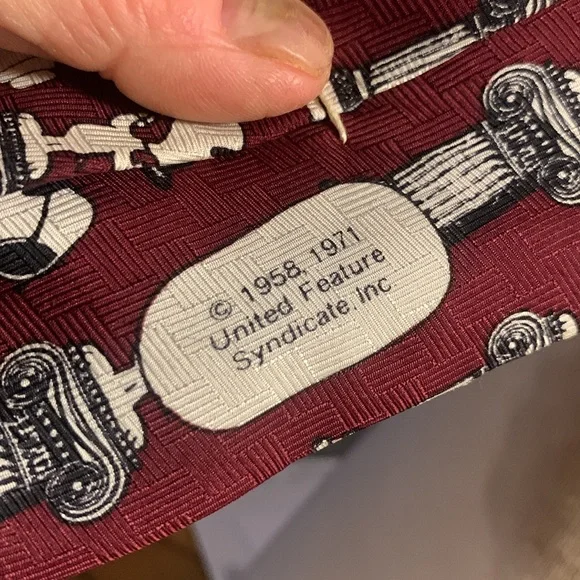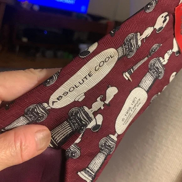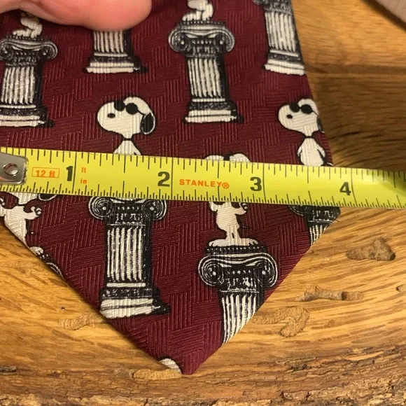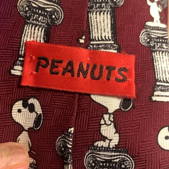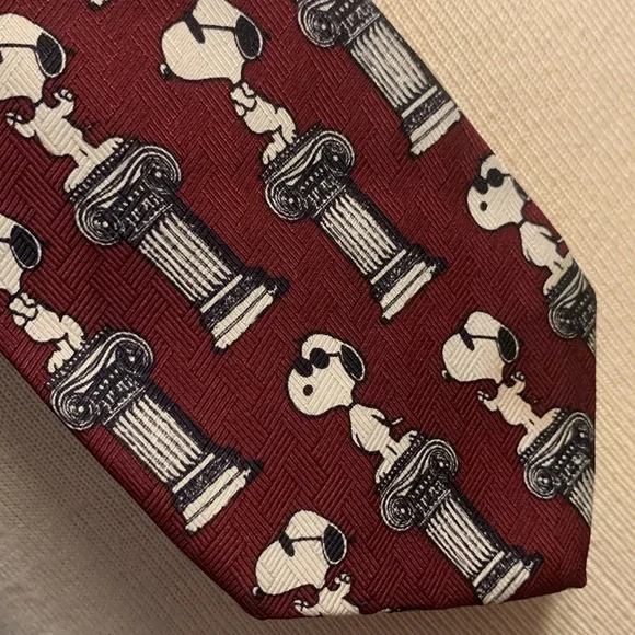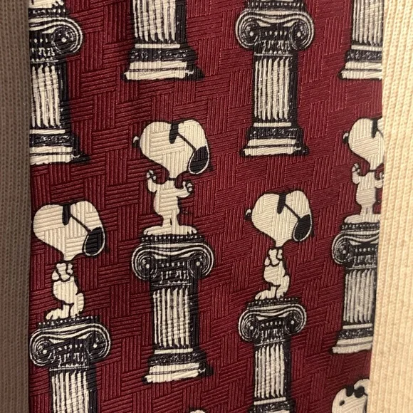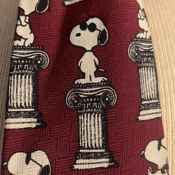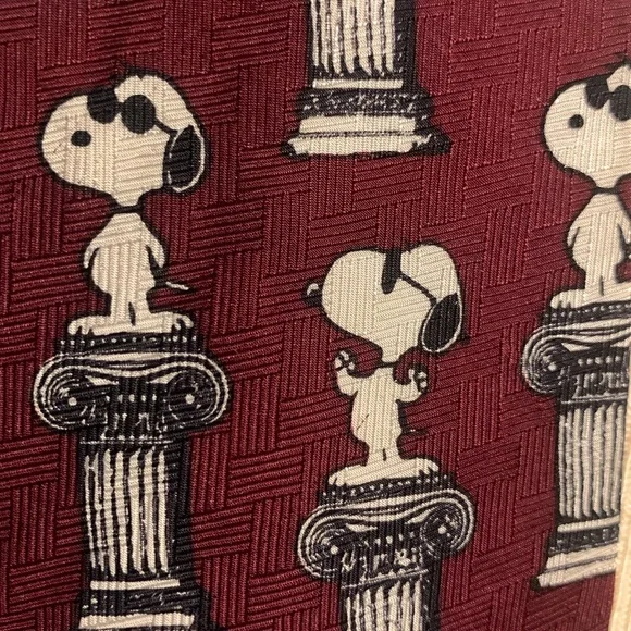 SNOOPY PEANUTS “ABSOLUTE COOL” NECKTIE. NO ONEis cooler than SNOOPY as “JOE COOL.” Burgundy woven silk background highlights Snoopy posing on Classical Greek Columns! PHOTOS show measurements and condition. No smoke,odors or pets. Tiny discoloration shown in photo on back side of tie.SNOOPY,Joe Cool,PEANUTS, CHARLES SCHULZ, Cartoon,United Feature Syndicate