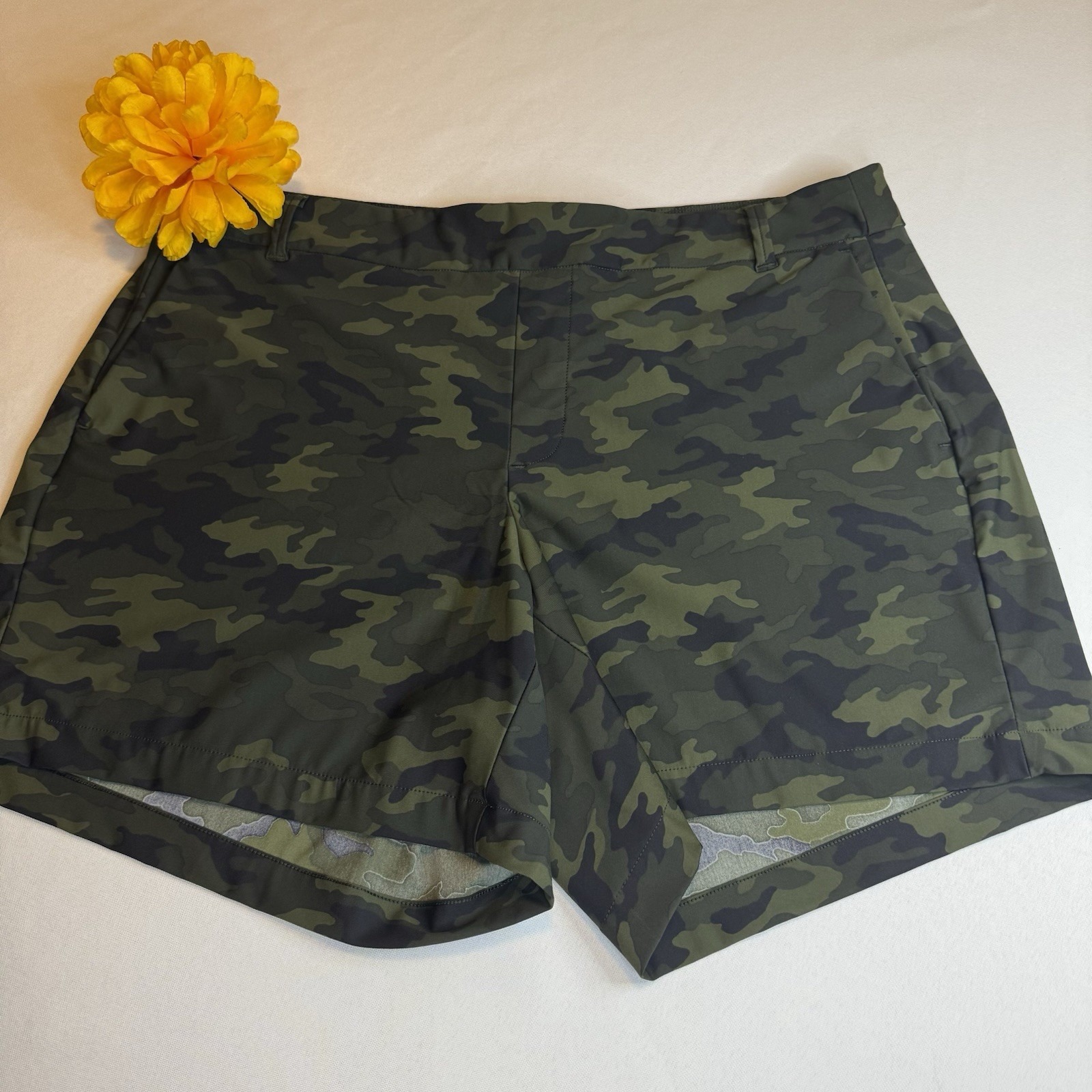 The Spanx 50213R Green Camo 6" Sunshine Pockets Shorts in women's size XL are versatile activewear shorts perfect for casual occasions. Made from a blended fabric of 59% nylon and 41% elastane, these shorts feature a mid-rise waist with an elastic waistband for comfort and a pull-on closure for ease. The 6" inseam and chino style give a flattering fit, while the colorful camo pattern adds a fun and trendy touch. Suitable for summer, fall, and spring, these lightweight and breathable shorts are machine washable for convenient care. Box A