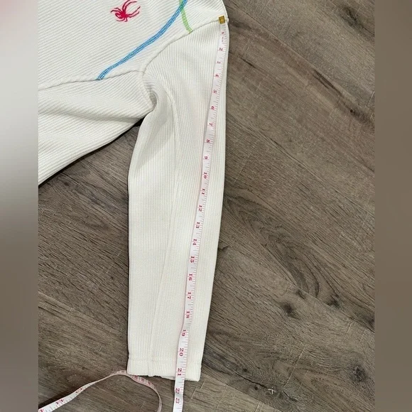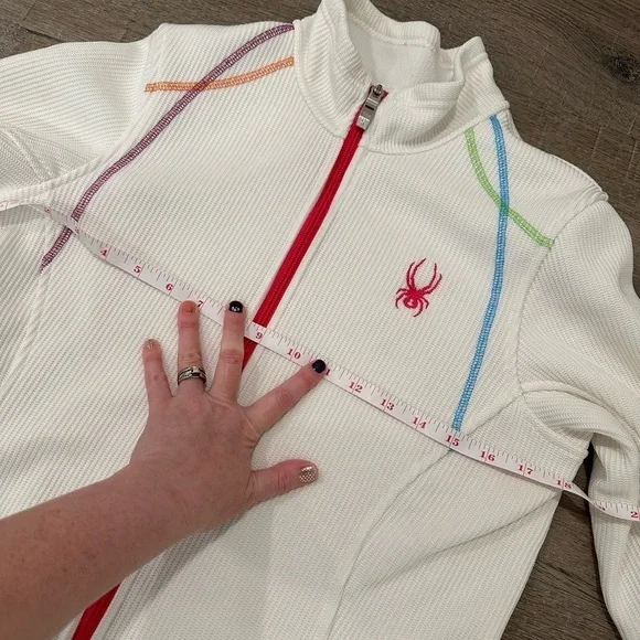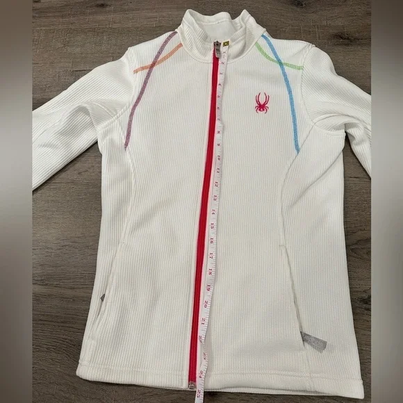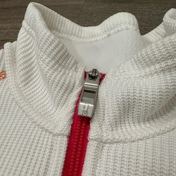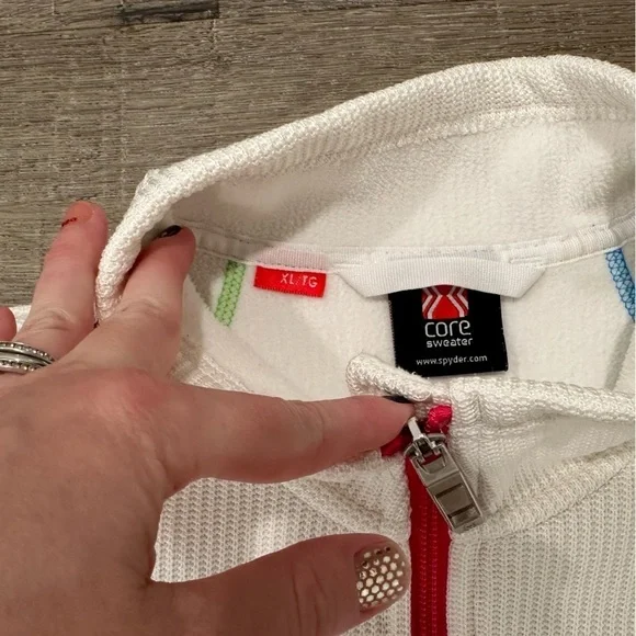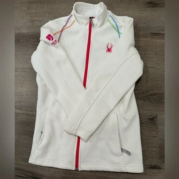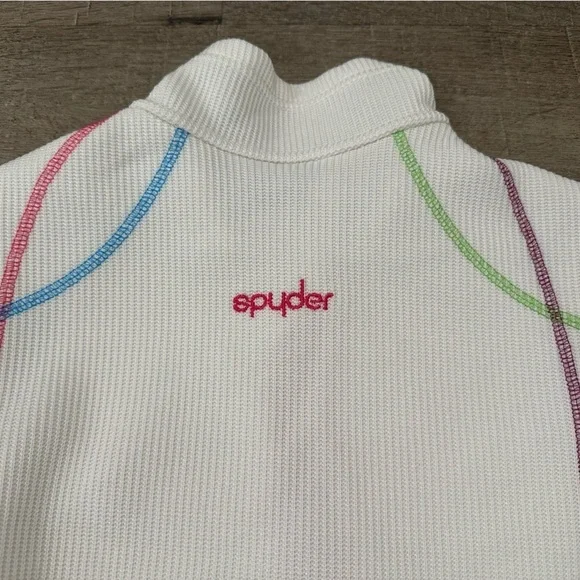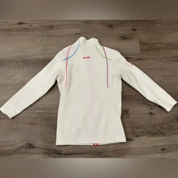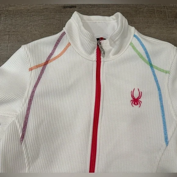 Spyder Virtue Full-Zip Core Sweater (Girls') XL. EUC. White with multicolor stitching. Embroidered Spyder logo. Embroidered Squaw Valley logo (now known as Olympic Valley - home of the 1960 Olympics).Nearly new condition! Some minor spots on sleeve (see photos) barely noticeable. No other known flaws. Fits similar to women’s XS or S. Questions? Leave a comment below!