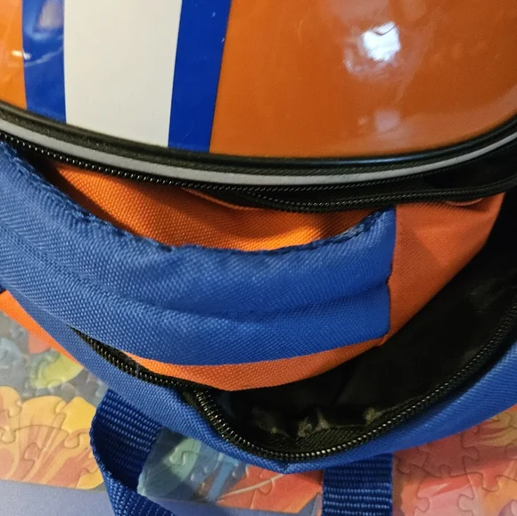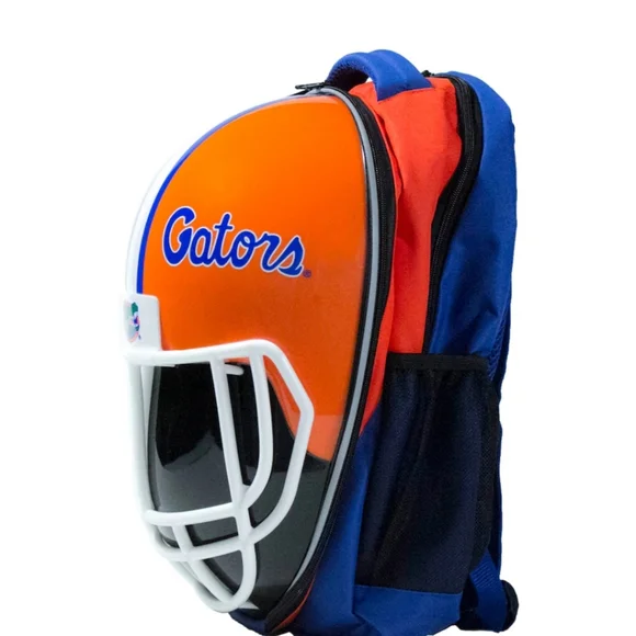 Orange and blue Gators football helmet backpack. Features team logo and design.