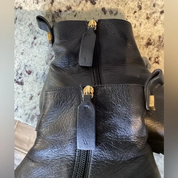 Leather boots with side zipper in very nice condition. Gold accent detail. Flaw- both boots have been professionally repaired on the inner side of the boots. Please see photo and is barely noticeable. I took several photos to show perspective. Price reflects flaw. Smoke and pet free home.