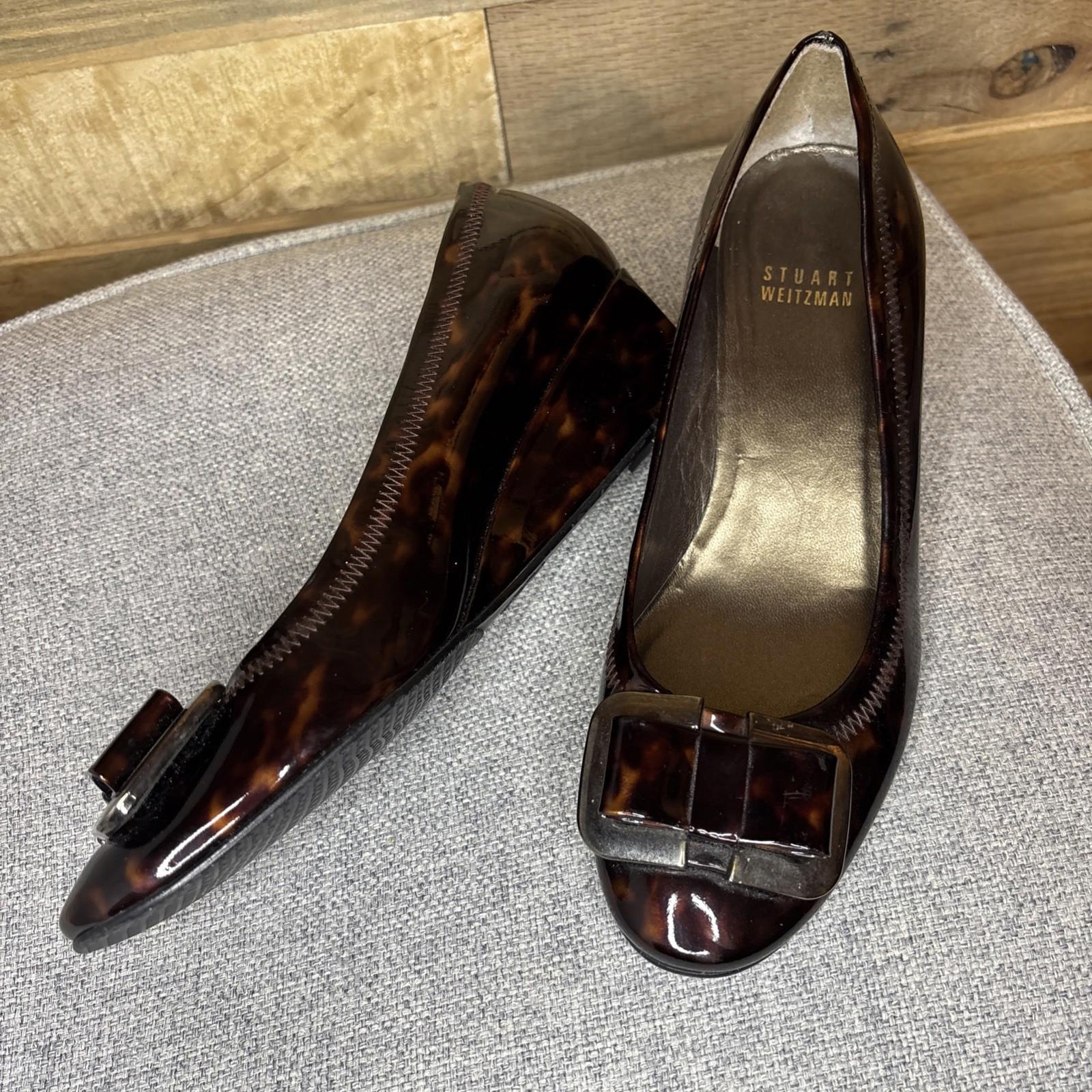 This stunning pair of Stuart Weitzman heels is perfect for any occasion, whether it's a business meeting or a party. The tortoiseshell pattern and shiny patent leather create a sleek and sophisticated look, while the wedge heel provides comfortable height. The slip-on style with a bow accent adds a touch of elegance and the round toe shape ensures a comfortable fit.