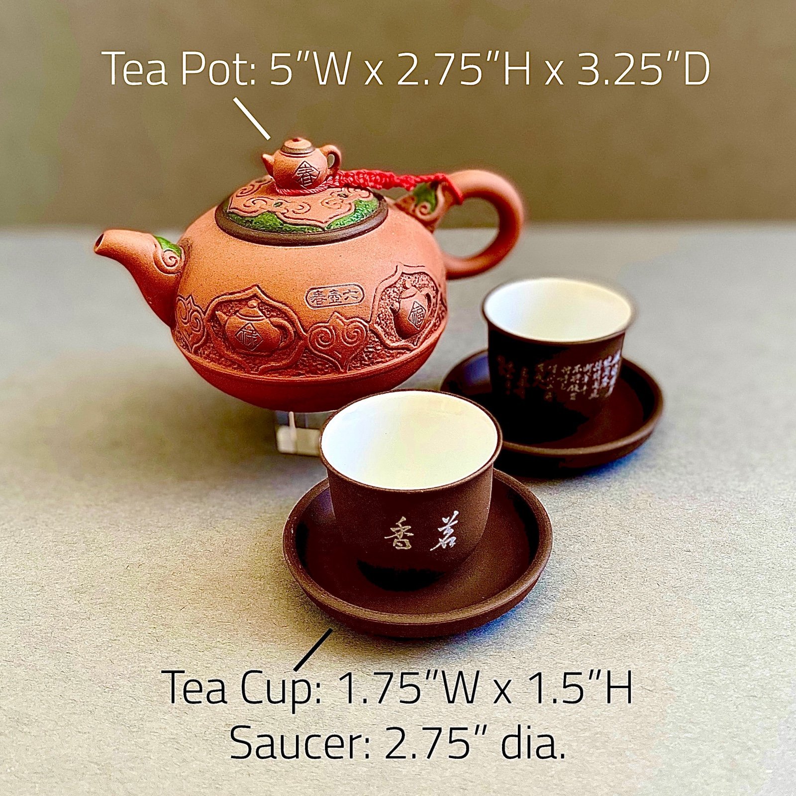 ◾️Size: Teapot W= 5in, H= 2.75in, D= 3.25in. Cup W= 1.75in, H= 1.5in. Saucer diameter: 2.75in.