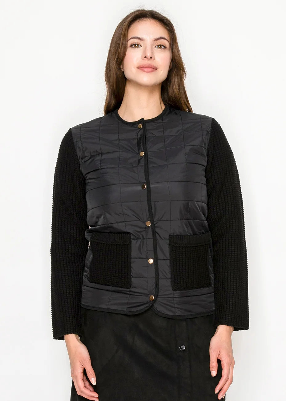 Part puffer, part sweater—this jacket does it all. The soft knit sleeves and oversized patch pockets bring texture, while the sleek quilted front keeps things polished. A smart pick for chilly days.