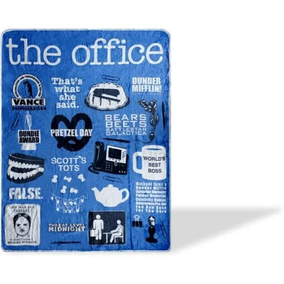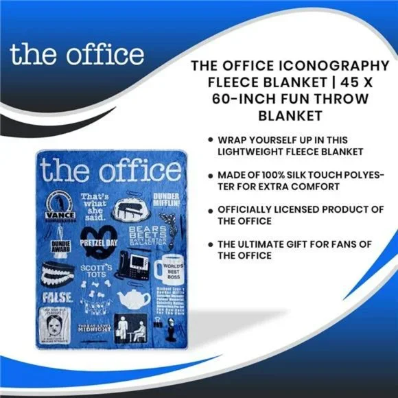 🧿Soft throw blanket: This snuggly and warm fleece throw blanket inspired by The Office is lightweight and extra soft to touch — perfect for a cozy night of watching the hit comedy series.🧿Quality and comfort: Made of 100% silk touch polyester, this soft throw blanket is designed for ultimate comfort. Measuring 45 x 60 inches, this fleece blanket is perfect for snuggling up and showing off your fandom for The Office.🧿Officially licensed merchandise: This soft fleece blanket is an officially licensed product of The Office.🧿Fun & functional: This throw blanket is a great home accessory for fans of The Office. Stylishly drape this warm blanket over your sofa or bed to add a cozy touch to your space — with a fun flair!