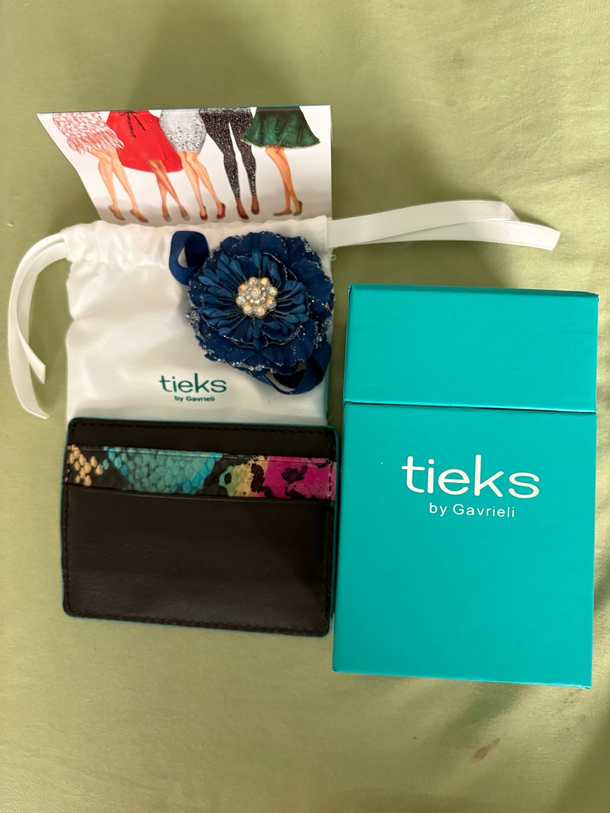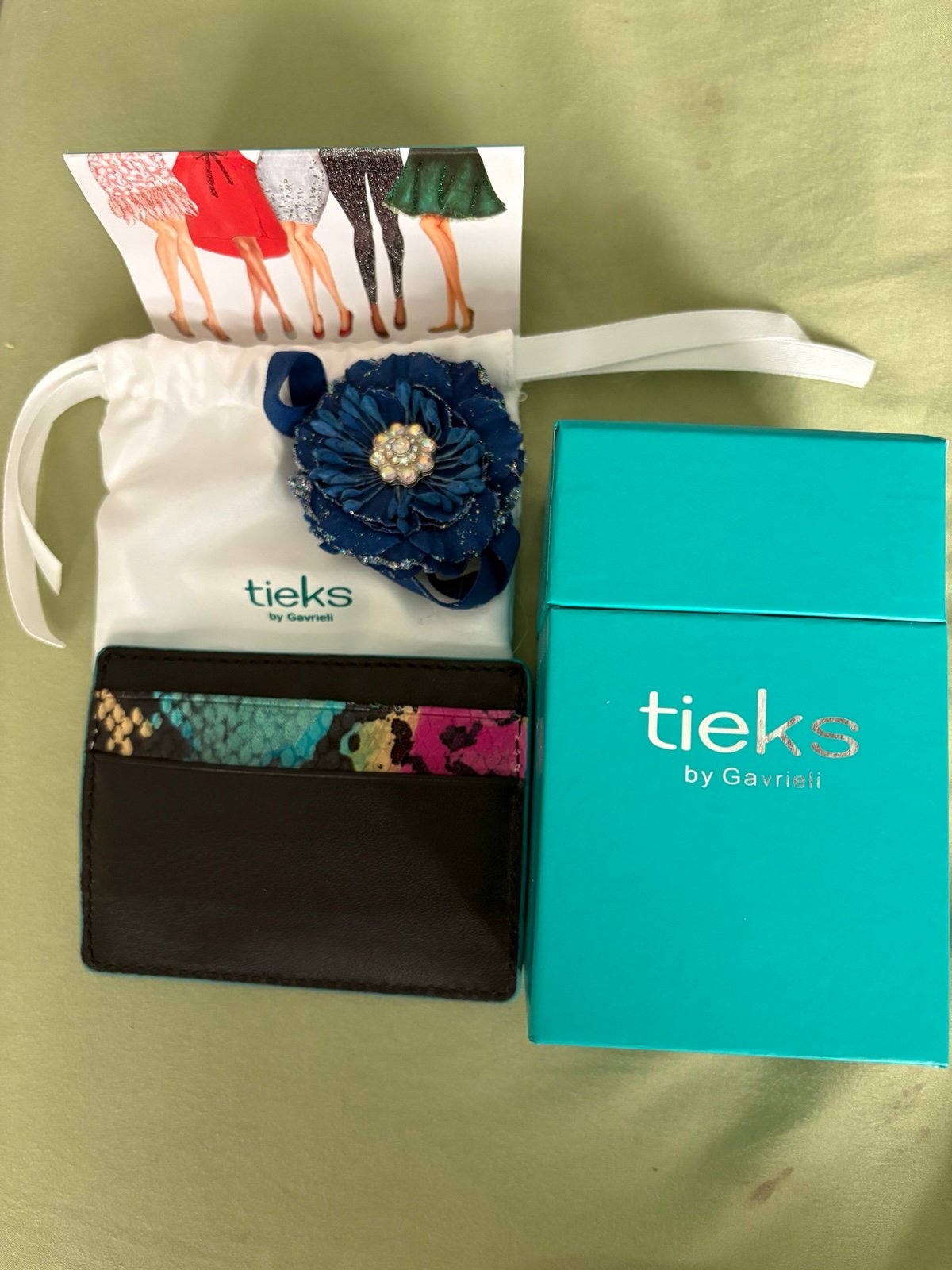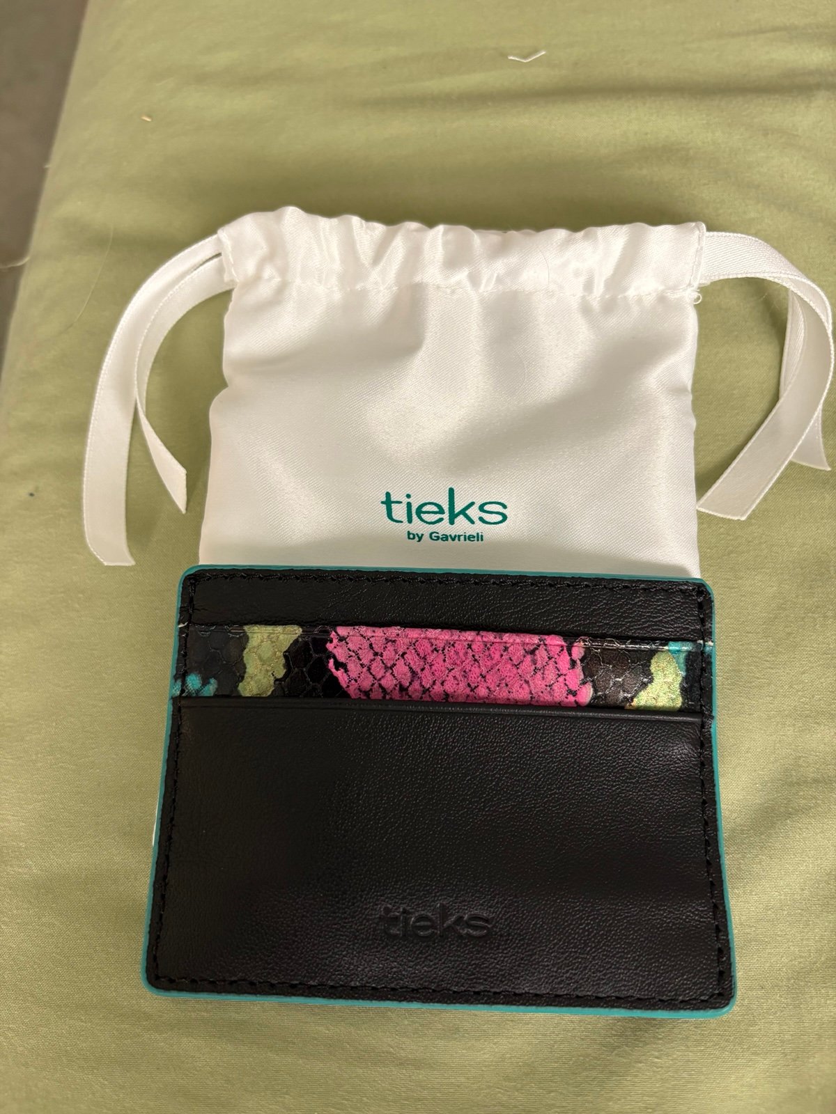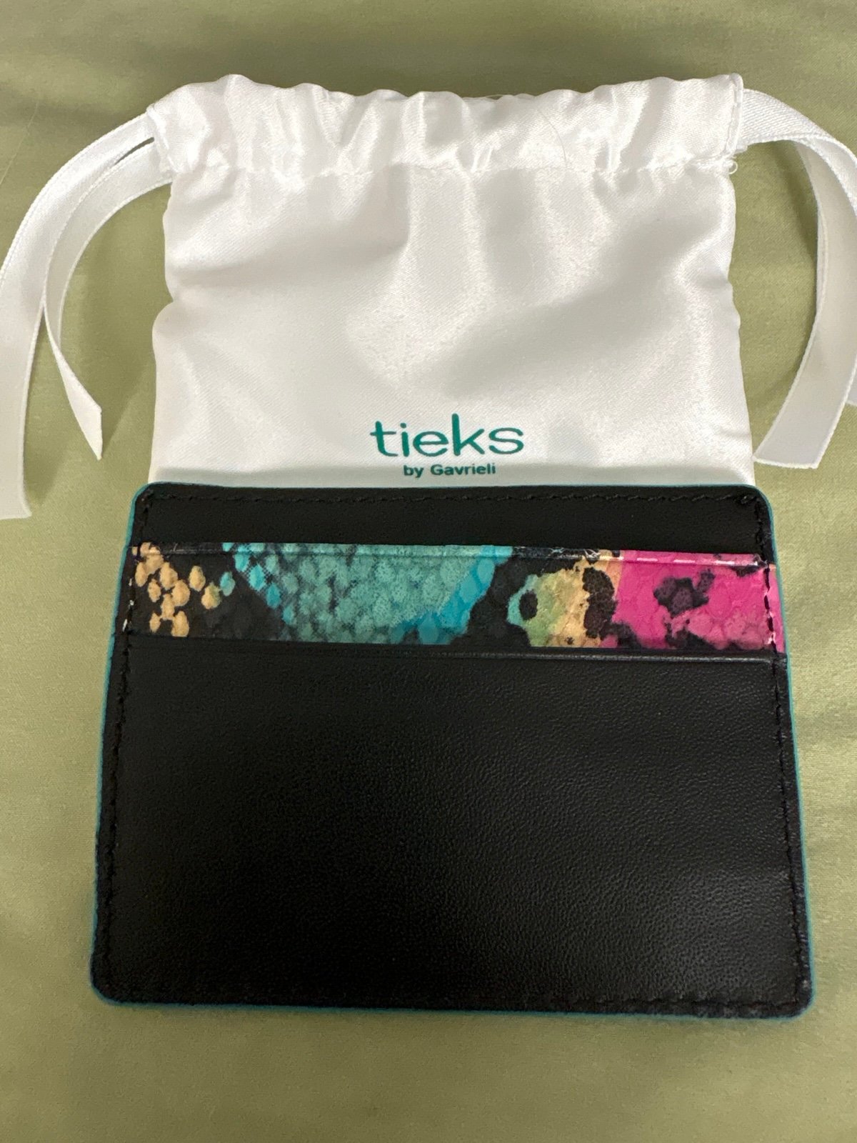 Crafted with our signature Italian artistry and leathers and modern design, the Tieks Card Case features a soft yet durable full-grain Matte Black leather exterior, Tiek Blue trim, and a band of leather in the color of your choice. Four exterior card slots and a center pocket hold your essentials in a sleek, chic silhouette.