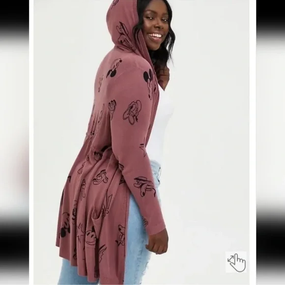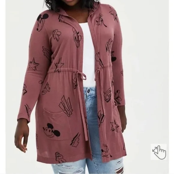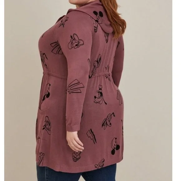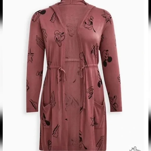 NWTNew in packageSize 4 4X 26#Disney Mickey & Friends Cinch Waist Hooded Cardigan - Rose BrownMATERIALS + CARERayon knit fabric.100% rayon.Machine wash cold. Line dry.Imported.DETAILSHooded.Open front.Cinch waist. Long sleeves.Pockets.Mickey Mouse & friends print. #daisy Duck#goofy#disney#her universe#hot topic