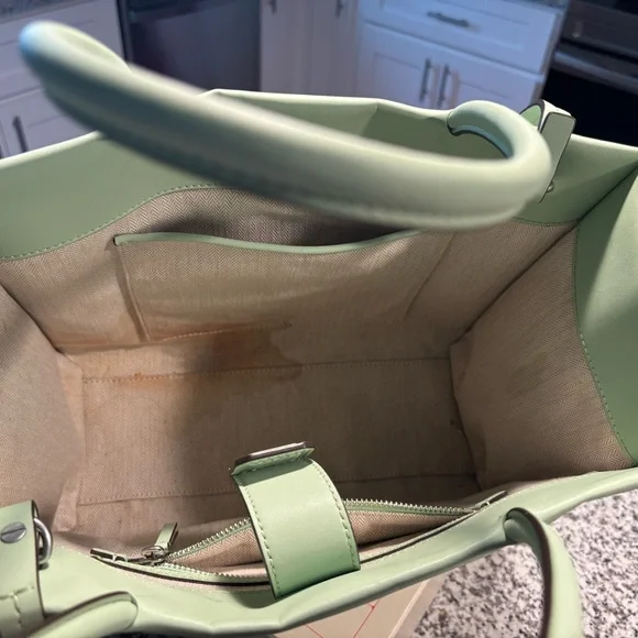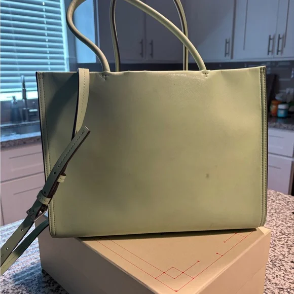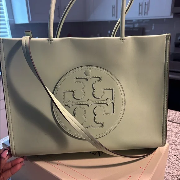 The Tory Burch Green Tote is a sophisticated accessory crafted in a structured design with a spacious interior. Its subtle tonal embossed logo adds a touch of elegance, while the double top handles and shoulder strap offer versatile carrying options. Perfect for those who appreciate a minimalist yet classic style. (needs to be cleaned inside)