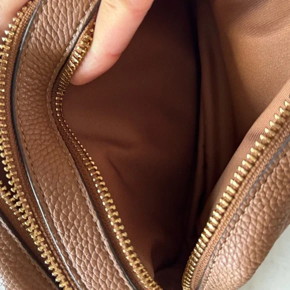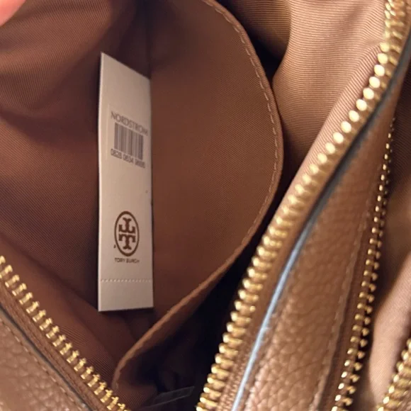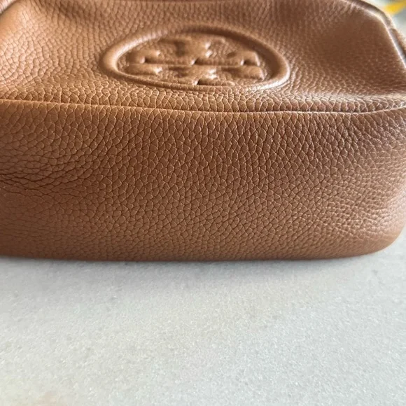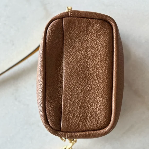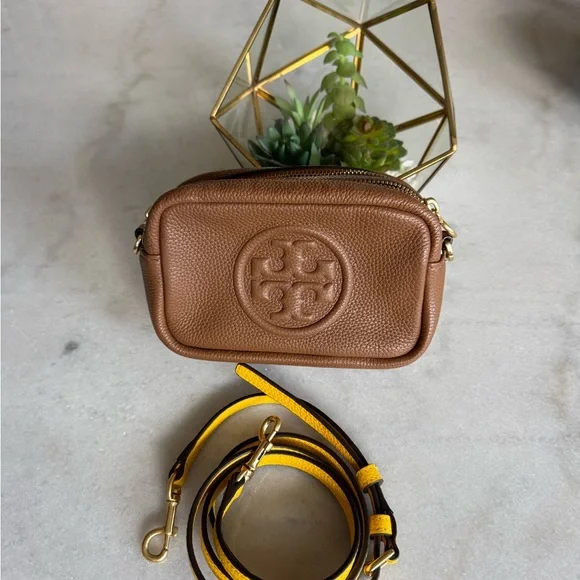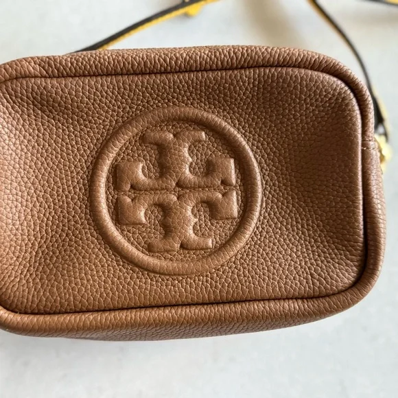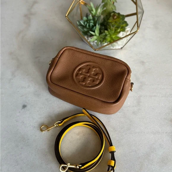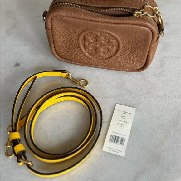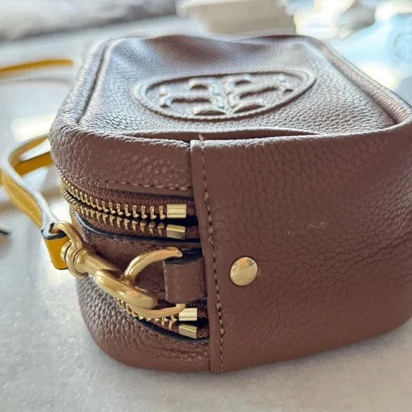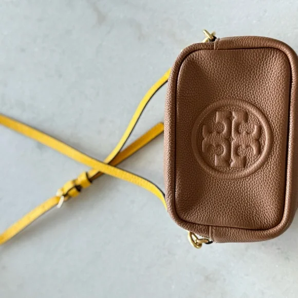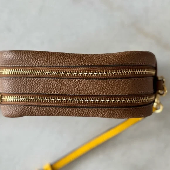 Stylish brown soft leather crossbody camera bag with a vibrant yellow strap. Perfect for any occasion.Tory Burch Bombe crossbody in soft tan leather. Removable yellow leather strap. NWT.