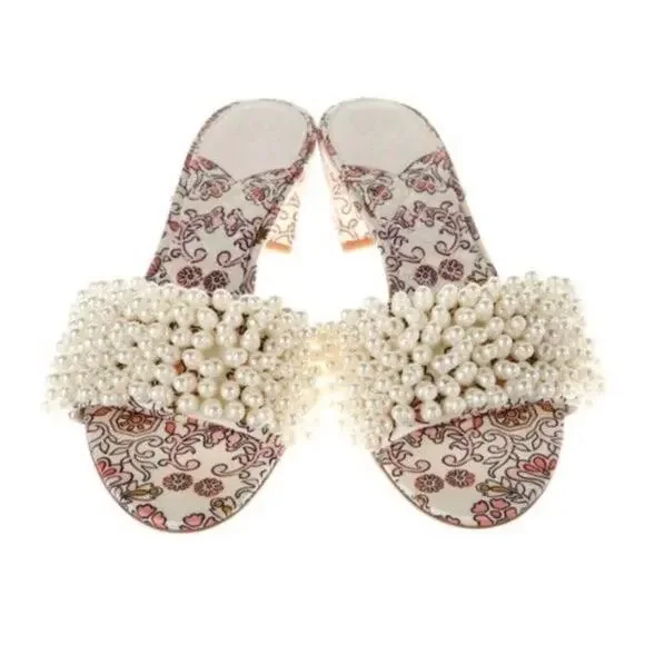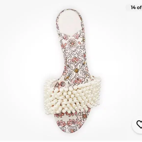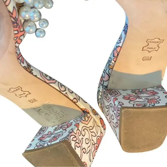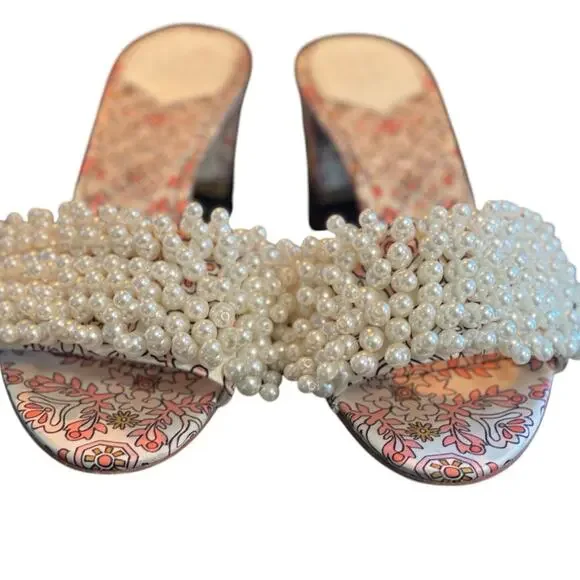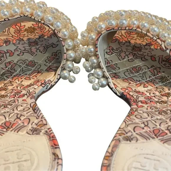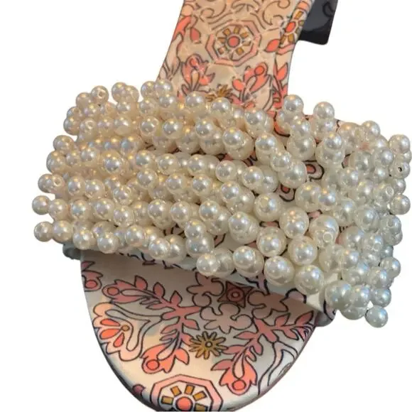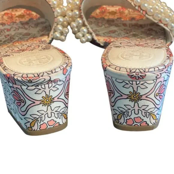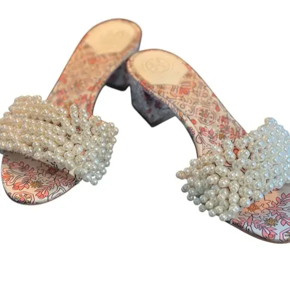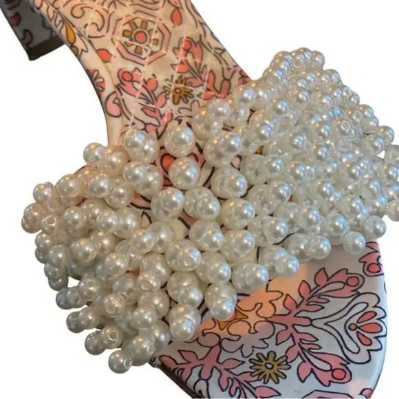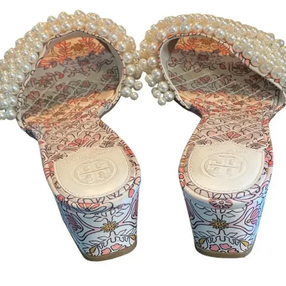 Tory Burch Tatiana Hicks Garden Pearl Embellished Slides, Parties, events, dates, Feminine wedding guest, 6. Very gently preowned.A collector’s dream!Printed Satin Hicks GardenFabric: SatinResin pearl embellishmentsSlide sandalsChunky heelOpen toeRubber heel patch at leather sole Parties, events, dates, Feminine, wedding guest, unexpected