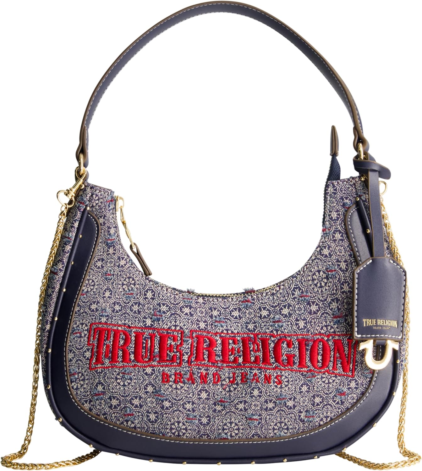 Experience the perfect blend of style and convenience with our True Religion Hobo Purse! This mini purse features a unique patterned denim exterior, sleek gold hardware, and a gold-tone chain strap for a timeless, classic aesthetic. This womens side bag features a removable chain shoulder strap with a drop of 30 inches, a top carry handle with an 8.5 inch drop, and features a spacious main compartment, front wall slip pocket, and an interior backwall zip pocket to keep your keys, wallet, phone, makeup supplies, and other small accessories conveniently stored. This cute and casual purse features a lightweight and durable blend of cotton and polyester fabric material to ensure this everyday purse is built to last. Our hand bags are officially licensed True Religion merch, ensuring you are receiving quality moon bags.