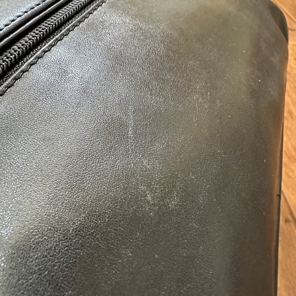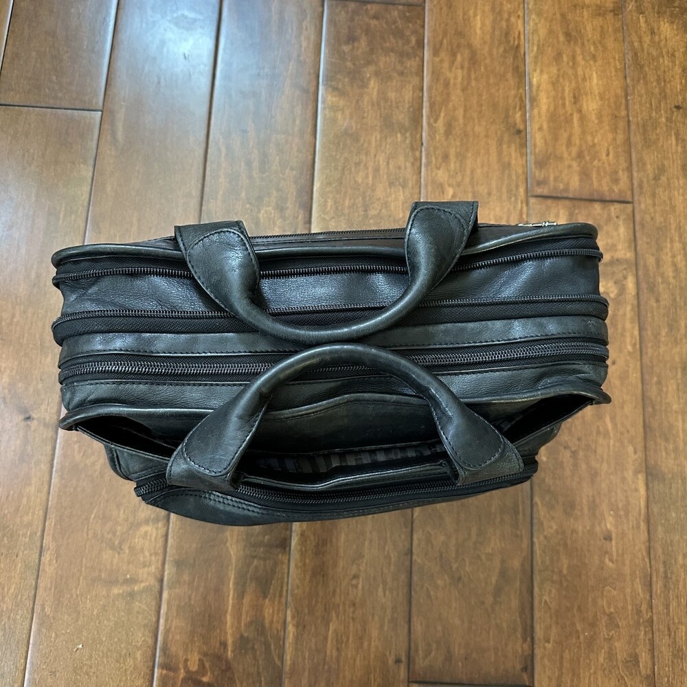 Features: Leather, Black color, Multiple compartments, Zipper closure, Handle