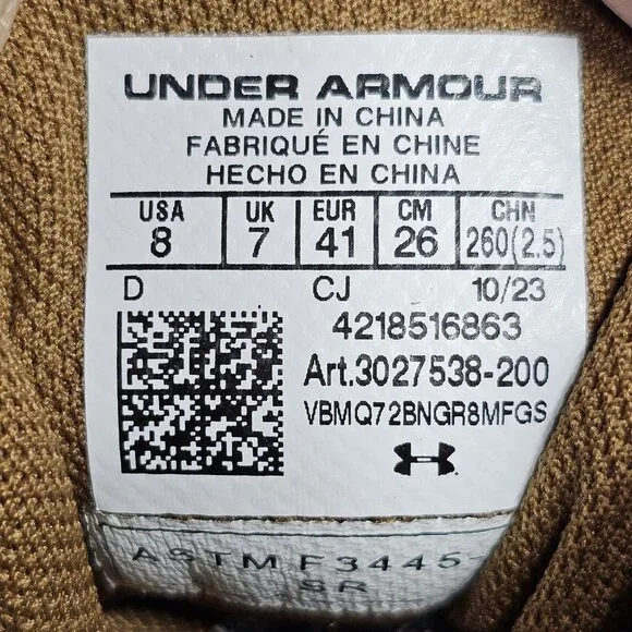 BRAND NEW - NWOT - NO BOX -Step into the toughest of conditions with the Under Armour HOVR Infil Waterproof Rough Out Tactical Boots. These boots are designed to keep your feet comfortable and dry, with a waterproof leather upper material that can handle even the wettest of environments. The coyote-200 color adds a touch of style to these combat-style boots, making them perfect for men who want to look and feel their best while on the job or in the field.The boots are available in a men's size 8, with UK Shoe Size 7, US Shoe Size 8, and EU Shoe Size 41. They are part of the Under Armour HOVR product line, featuring a combat-style design and waterproof features that make them ideal for all seasons. These boots are not only functional but also stylish, with a brand like Under Armour that is known for producing high-quality athletic gear.