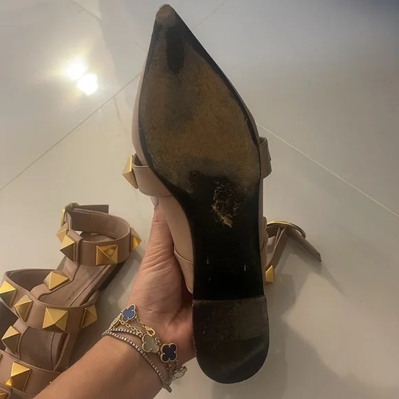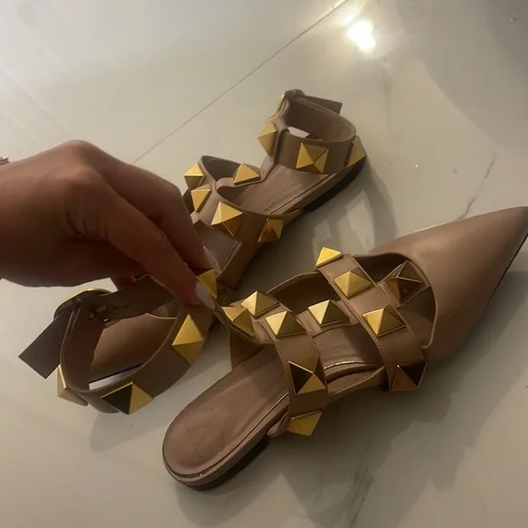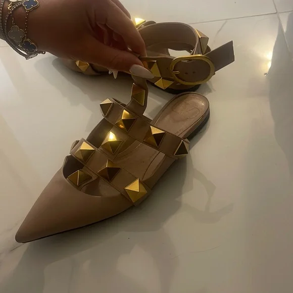 Valentino GaravaniRoman Stud pointed-toe ballerina shoesYou've reached peak shoewear style. That's thanks to the gold-tone Rockstud detailing on these Valentino Garavani pumps. You've always been a step ahead.Made in ItalyCompositionOuter: Calf Leather 100%, Metal 100%Lining: Calf Leather 100%, Lamb Skin 100%Sole: Calf Leather 100%