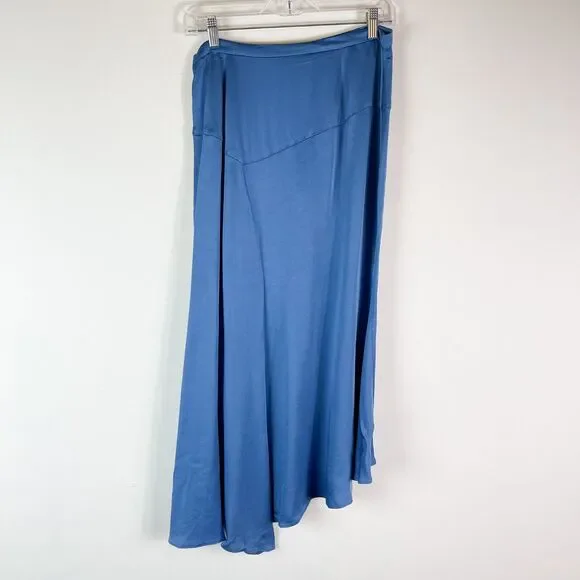 Veronica Beard NWOT Blue Autumn Asymmetrical Hem Midi Skirt Size 6Finished with an asymmetrical hem and seam details for a contemporary twist.Side Zip closure.Not lined.Not stretchy.Satin feel and look.Uneven hem that V at center.Approximate Measurements Laying flat without stretching:Center Back Length: 35.5”Waist: 15”MSRP $395