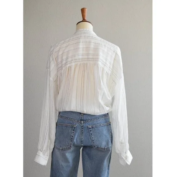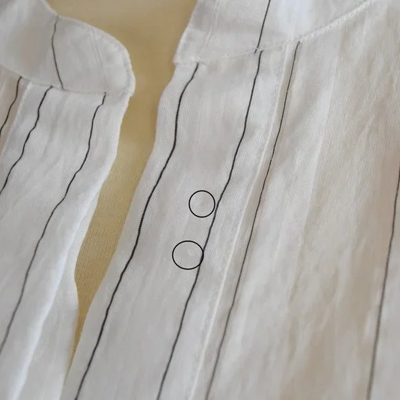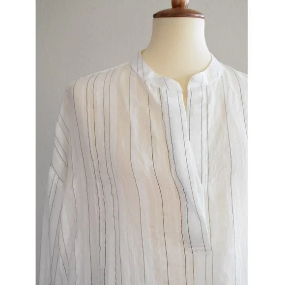 VINCE Drapey Striped Pullover Top white and black LargeA crinkled fabric and the slimmest of stripes play nicely with the relaxed fit of this wear-anywhere top cut from a breezy, lightweight fabric.- Split neck- Long sleeves with one-button cuffs- 72% rayon, 27% nylon, 1% polyester- Dry clean or hand wash, dry flat- Imported- IndividualistTagged a Large, PTP 24", Length 26"Excellent used condition. Refer to last photo for two very small pin-sized marks on the neckline.