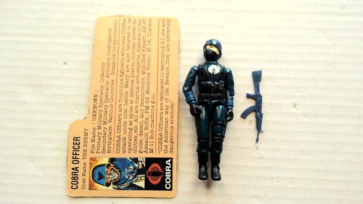 Old GI Joe; A Real American Hero swivel arm Cobra Officer action figure by Hasbro from 1982-83. He comes with his AP gun (blue) and his cut file card. His limbs are tight and his chest emblem has not rubbed off. Nothing seems broken on the figure. He has a good o-ring.