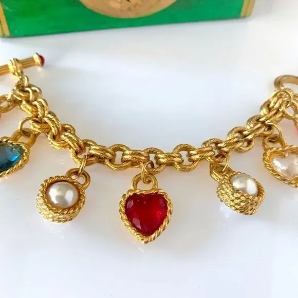1980’s Vintage Givenchy Gripoix Byzantine Charm BraceletGold plated Byzantine chain with seven oval, circle and heart shaped gold encrusted charms made of multicolored glass stones and pearls. Toggle clasp closure with ruby colored accent stones. Heavy weight. Measures 8” in length. Signed hang tag is missing. Has minor wear at clasp. Heart charm designer luxury gold glass cabochon chain link toggle gift for her Valentine’s Day love gift birthday anniversary vintage charm bracelet pearls gold chain link chunky statement special