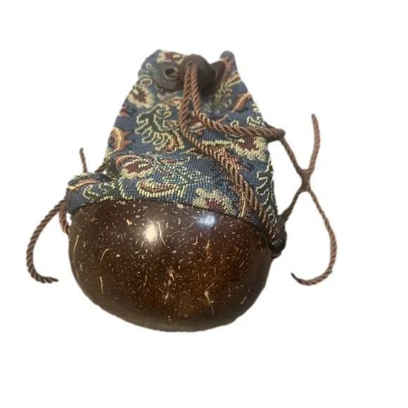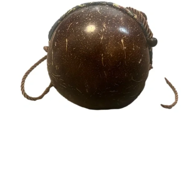 This exquisite handmade bag is made from polished coconut shell and Fabric It has a beautiful natural polished pattern and is perfect for casual or party/cocktail occasions. The bag has a cross-body strap and measures 4 inches in width, depth, and height.It has black hardware color and the handle/strap material is of rope. It is a vintage piece and has a boho/tropic character.Pet And Smoke Free HomeDBT