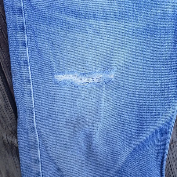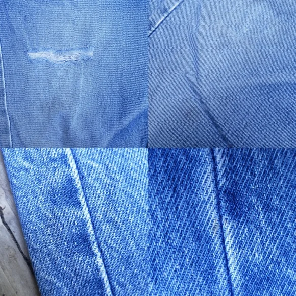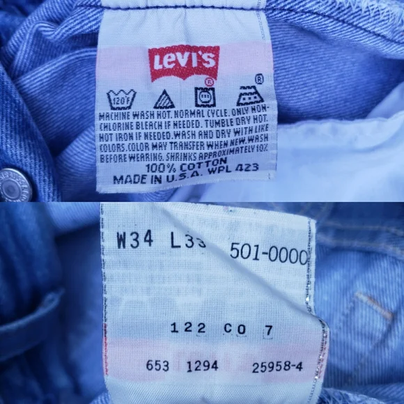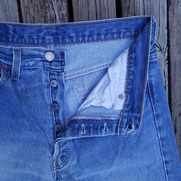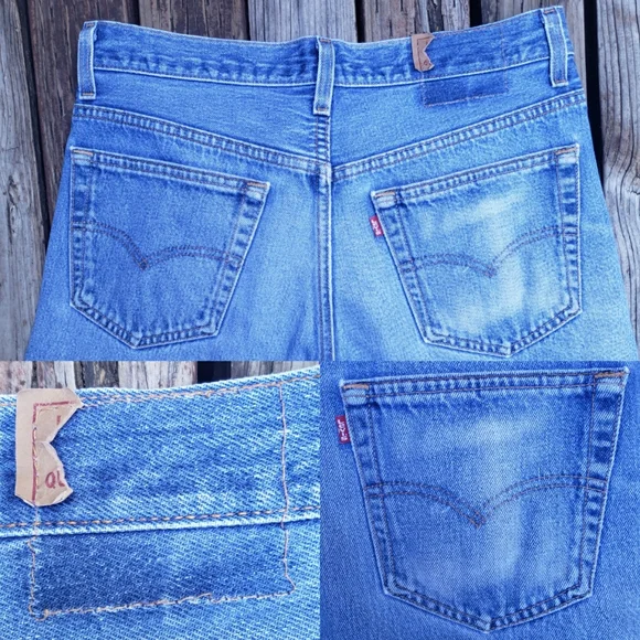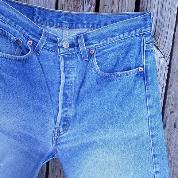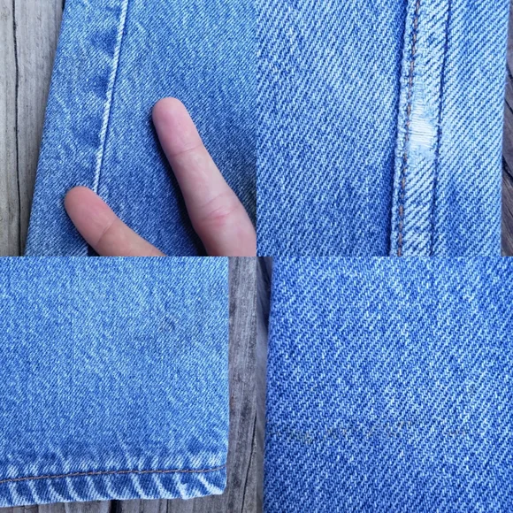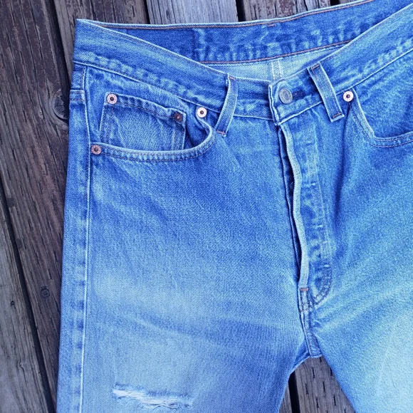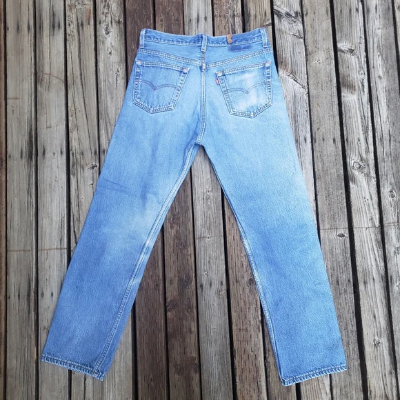 Vintage Levi's Medium Blue Faded, Broken In and Distressed Jeans - W34 L33. Brand: Levi's. Size: W34 L33. 100% Cotton. Made In USA. Button inside says, 653 and that matches tag inside. These have been washed, worn and loved. They have lots of man made uniqueness and distress to them. They are definitely broken in and still have lots of life left in them. (5) Buttons open/close. Belt Loops. Red tab in back. The cardboard tag in the back is missing and only a tiny corner is left on jeans. Medium Blue color and lots of material lighting here and there, especially on edges and seams. There are multiple areas with raw material or holes (legs, front) or light staining (that was hard to photograph). Bottom of legs show some wear and roughness but nothing too horrible. In the back, back pocket shows wallet outline/fading. In the back, on the LEFT leg when worn there's a more noticeable stain/spot as well as a rubbed raw area on the inner seam- shown in collage picture. Please see all pictures of wear as these aren't new or perfect. These are older and do have an older smell to me, washed in clear/unsented detergent- so could use a good wash! -MEASUREMENTS LAYING FLAT-[Waist (Side To Side): ABOUT 15"][Inseam: 29.5” 29.75" LONG]