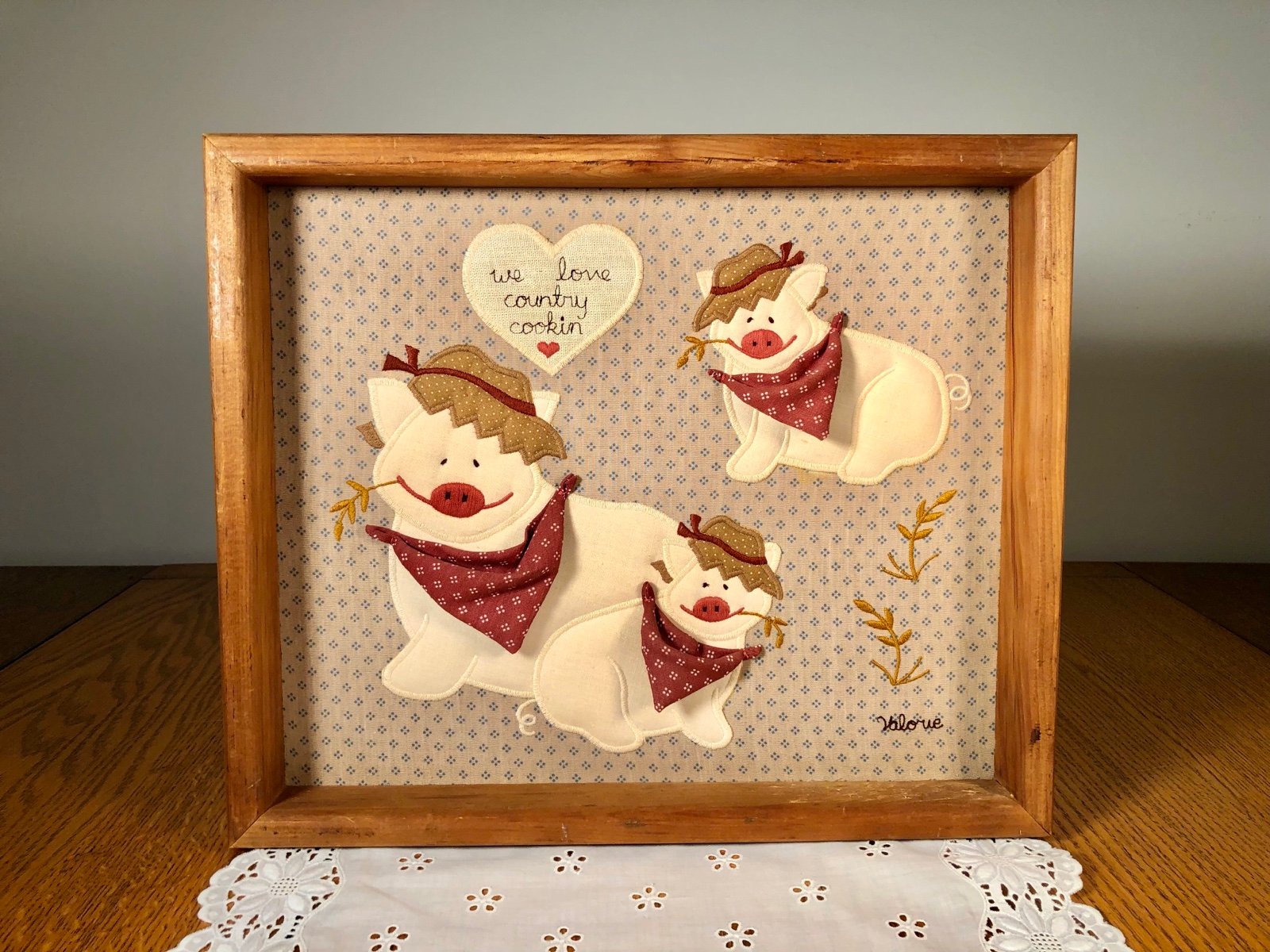 “We love country cookin” Adorable country dressed pigs/piglets with matching hats and dimensional handkerchiefs. Art is set in a solid wood frame and comes ready to hang.
