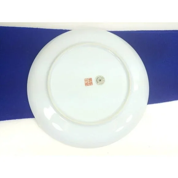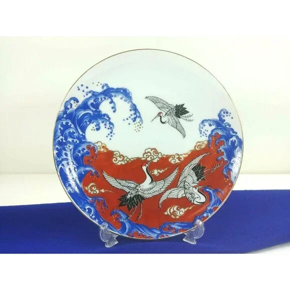 This stunning vintage Takakashi Porcelain Decorative Plate features a beautiful floral pattern and comes with an easel. It is chop marked and includes the original decal, making it a unique piece for any collector. • Vintage Takakashi brand• Multicolor floral pattern• American Directoire style• Made of high-quality porcelain• Includes an easel for display• Chop marked with original decalThis has 3 Black and White Cranes flying over a swirling red and blue sea.Is a beautiful plate to hang on your wall or use the easel to display on a shelf.