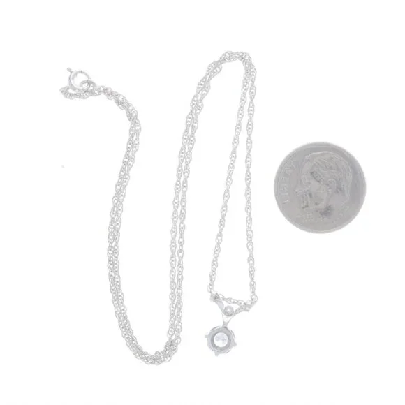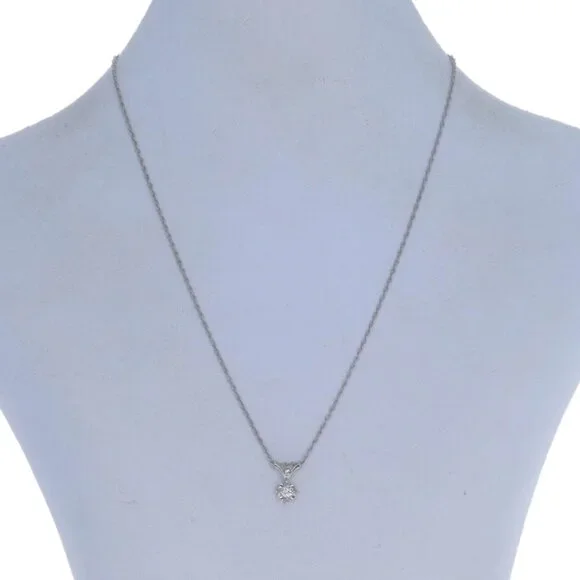 Metal Content: 14k White GoldStone InformationNatural DiamondCarat(s): .15ctCut: Round BrilliantColor: HClarity: VS1Natural DiamondCarat(s): .01ctCut: SingleColor: GClarity: VS1Total Carats: .16ctwStyle: Solitaire with AccentChain Style: Prince of WalesNecklace Style: ChainFastening Type: Spring Ring ClaspMeasurementsItem 1: PendantTall (from stationary bails): 1/2" (12.5mm)Wide: 9/32" (6.9mm)Item 2: NecklaceLength: 15"Width: 1/16" (1.3mm)Weight: 2.1 GramsStamps: 14ktCondition: Pre-OwnedProfessionally cleaned, polished, and tested to guarantee metal content.
