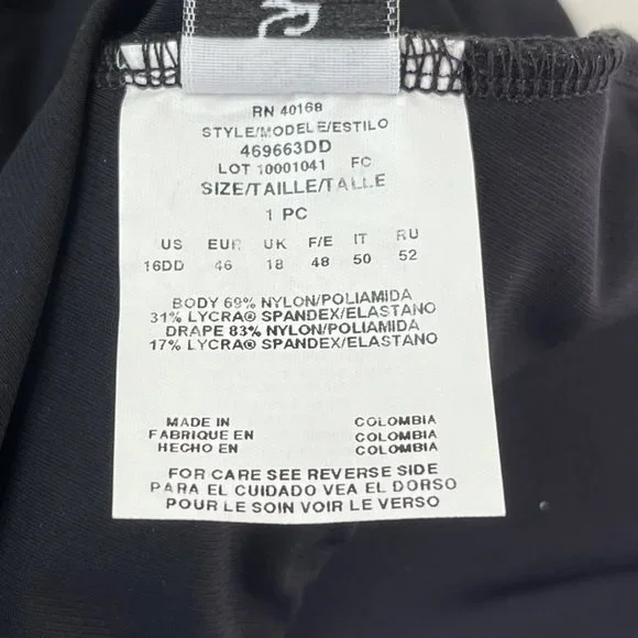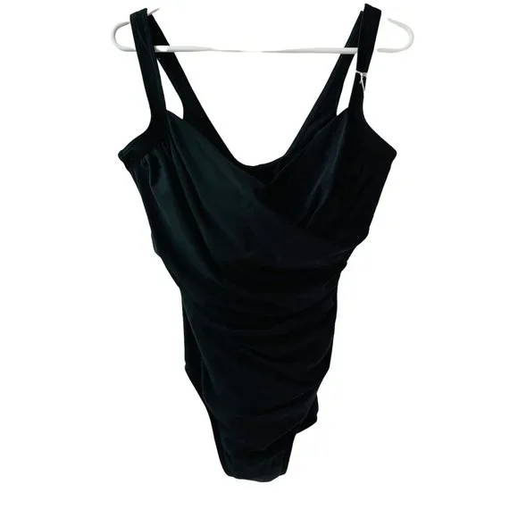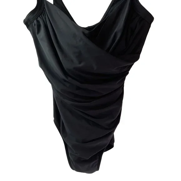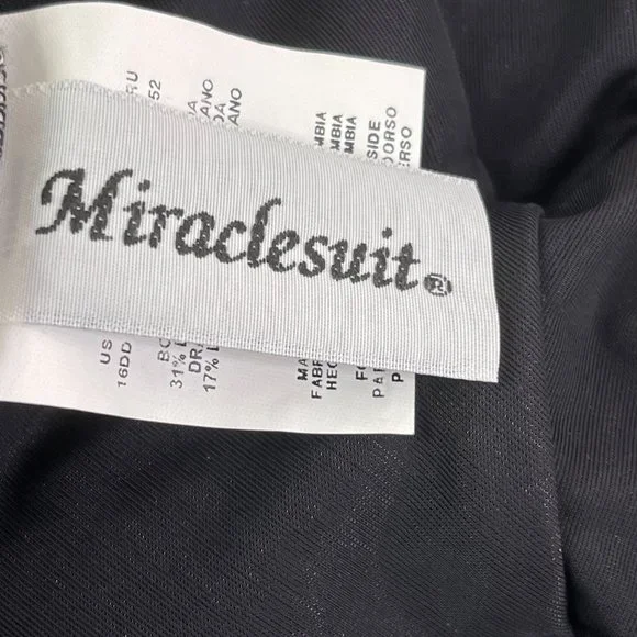 Plus size one piece swimsuit in solid Black with all over ruching and underwire bra for support. Size 16DD Tall New with tags, hygienic strip still in place.Measurements from the Miracle Suit Size ChartBust 46.5"Waist 34.5"Hips 45.5"Center front neckline to Crotch 23"Torso 67"Shipping weight is 12 ounces from FloridaFeatures:• One PieceSize: Womens 16DD TallCondition: New With Tags