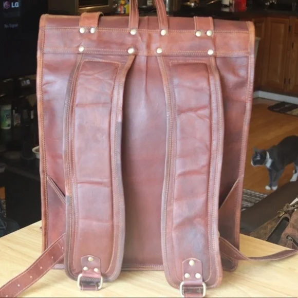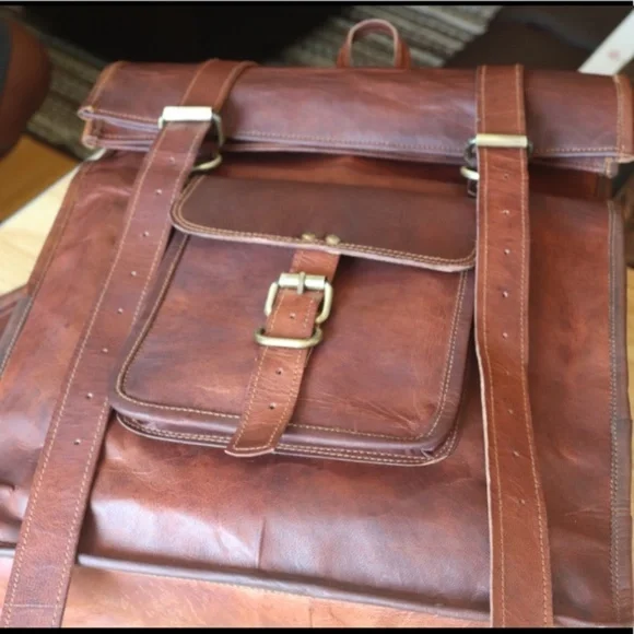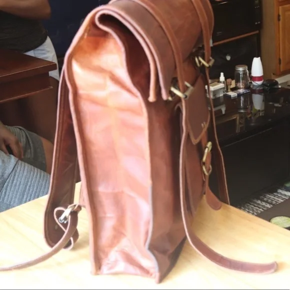 IMPORTANT: PLEASE READ- BUNDLES of 3 or more items are discounted at 15% off Total Bundle- No other discounts or offers will be negotiated- FINAL PRICE items are not eligible for Bundle Discount- Just check out on your BundleNever used too big for my useBespoke backpackWeathered brass hardware WWll inspired roll topSingle exterior buckle w/strap pocketInterior zipper pocketTwo interior width slip pocketsFits 20” laptop Processed without the use of chemicals or dyes.This backpack is Gorgeous!Dimensions: 23” H x 14”L x 4.5”WMaterial: Goatskin leatherExcellent ConditionNo holes, stains, tears, odor*Reasonable offers only please…Thank-you!~PLEASE FEEL FREE TO ASK ANY QUESTIONS BEFORE PURCHASEYOUR SATISFACTION IS IMPORTANT TO ME ~ 🥰SPECIALS:*** Spend $25 or more and choose any $10 FINAL PRICE item for FREE *** SEE LISTING INFORMATION IN MY CLOSET!"Be present in all things and thankful for all things"...Maya AngelouInventory #41623
