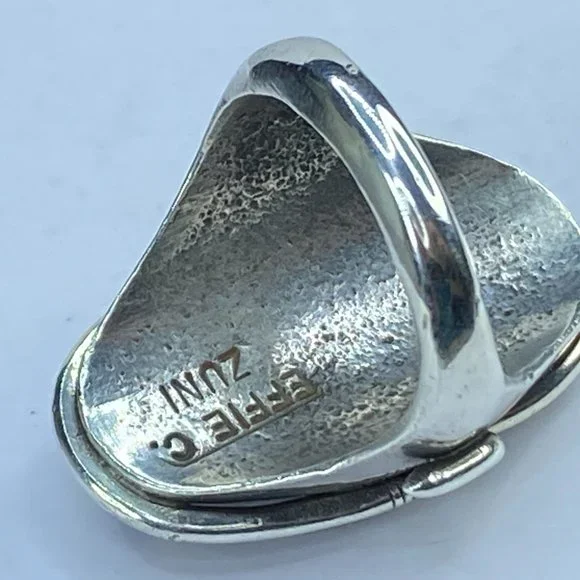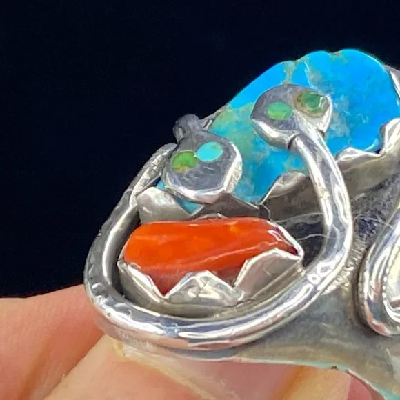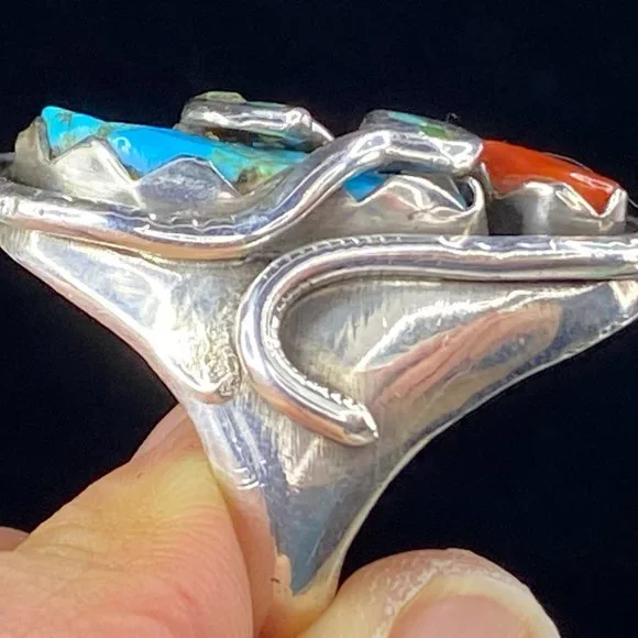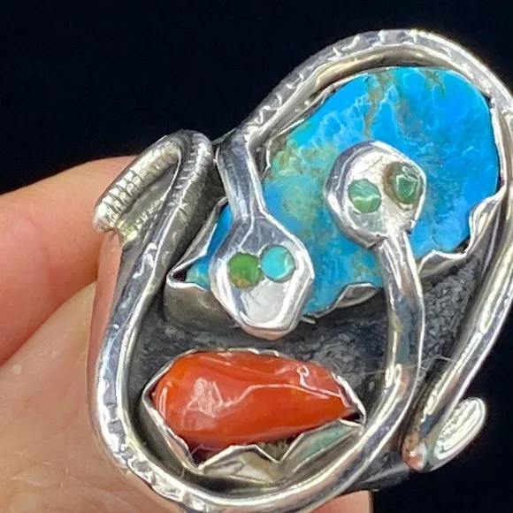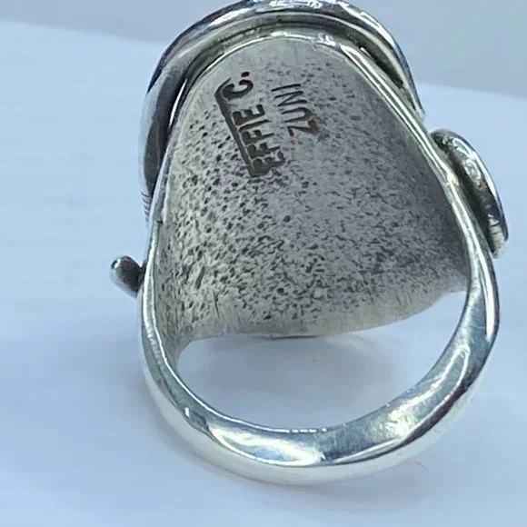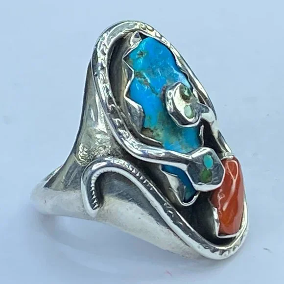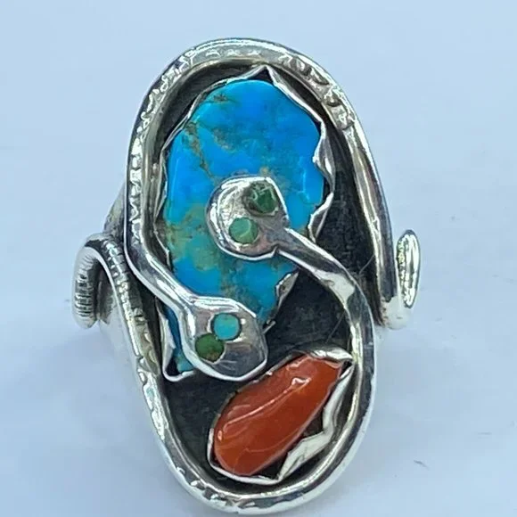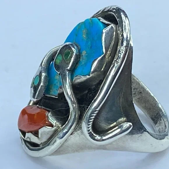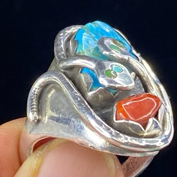 The Zuni Effie sterling silver Turquoise Coral snake men's ring is a handmade ring by the famous Zuni artist Effie Calavaza. The ring features natural Sleeping Beauty turquoise and Mediterranean coral stones set in a sterling silver ring setting. The ring also features Effie's traditional snake design, which symbolizes life, death, rebirth, defiance, and wisdom.The ring is size 10.5, weight 26.9gm, ring top is 1 1/4" x 20.8mm. Hallmark.(1 inch = 25.4 mm; 1 dime = 17.9mm).Ali items are pre-owned unless otherwise stated. This means they have the usual aspects of pre-owned jewelry, such as light scratches, wear and tarnish. Please review all the photos which will be part of the description.